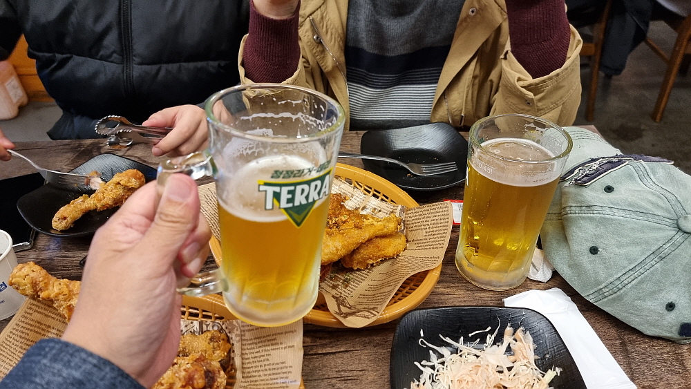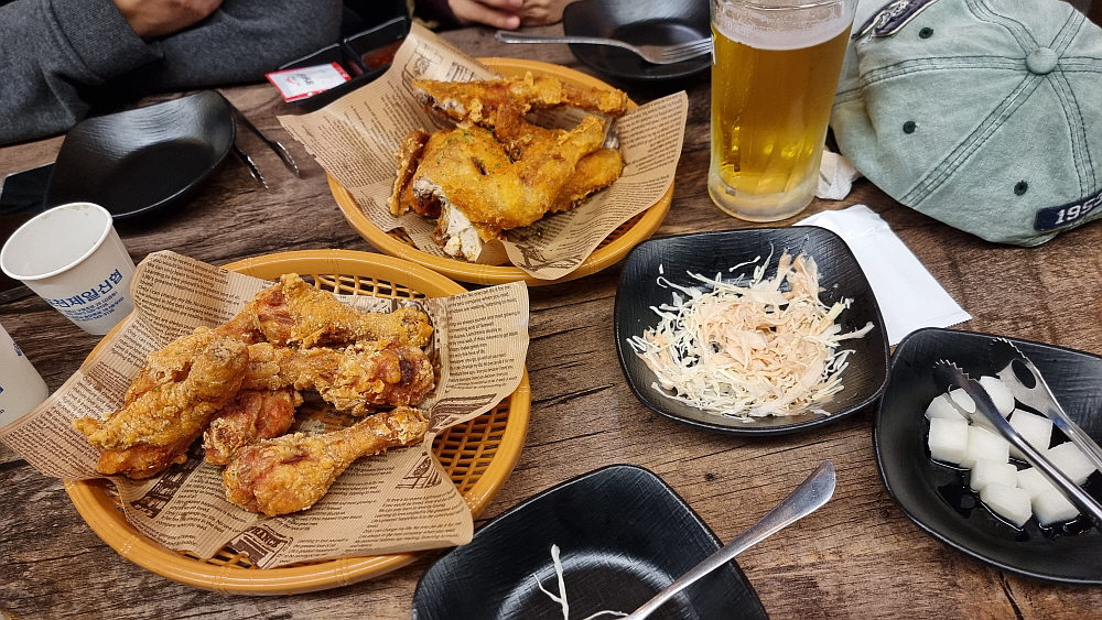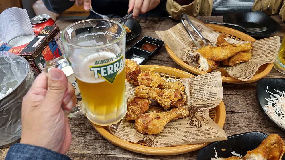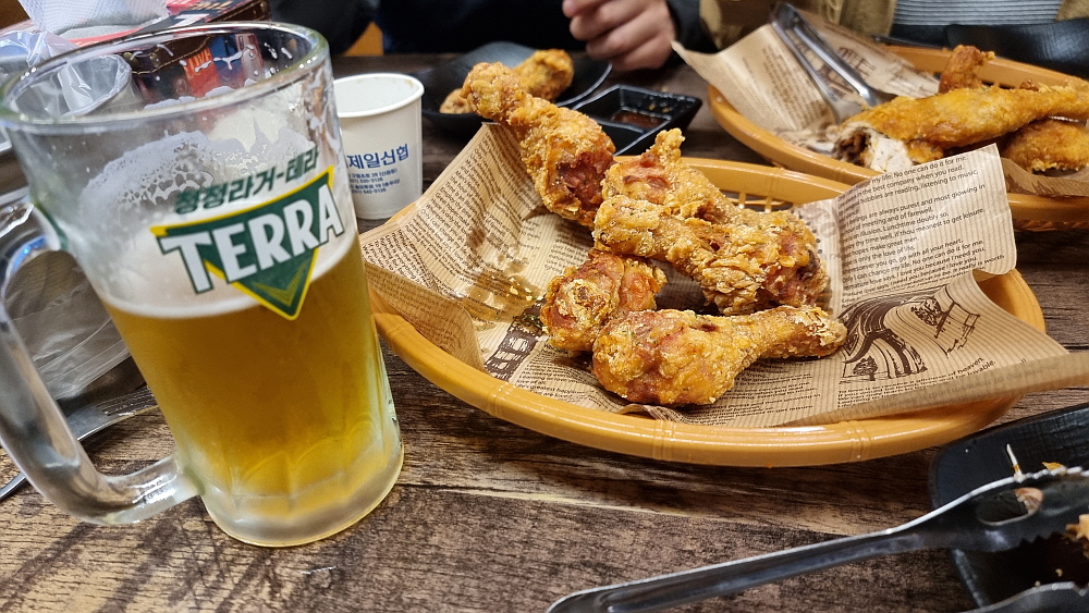 그리고 원래 치킨은 생맥주와 함께 해야 한다. 이것은 일종의 국룰이다. 여기에다 막걸리를 먹는다? 전혀 아니다. 고량주? 양주? 노노~ 소주까지는 그래도 어느 정도 용서가 되지만 다른 주종은 불허하는 것이 후라이드 치킨이다. 하지만 이상할 정도로 맥주와는 찰떡궁합이다. 사실 예전엔 맥주보다는 소주의 안주로 후라이드 치킨을 많이 먹었다. 하지만 언제부터인가 치맥이라는 단어가 생길 정도로 맥주와 환상의 한 팀이 되었다. 이런 것이 문화의 힘이다. 평소 맥주를 잘 먹지 않던 사람도 후라이드 치킨 한 조각을 입에 넣으면 바로 맥주 생각이 나게 만드는 신기한 경험을 할 수 있다.