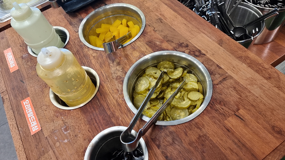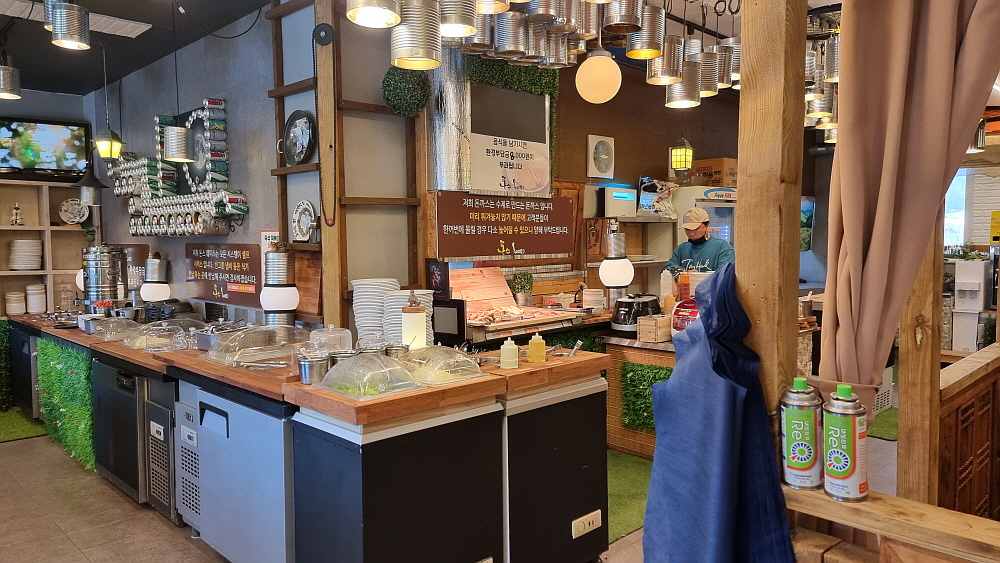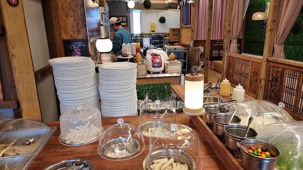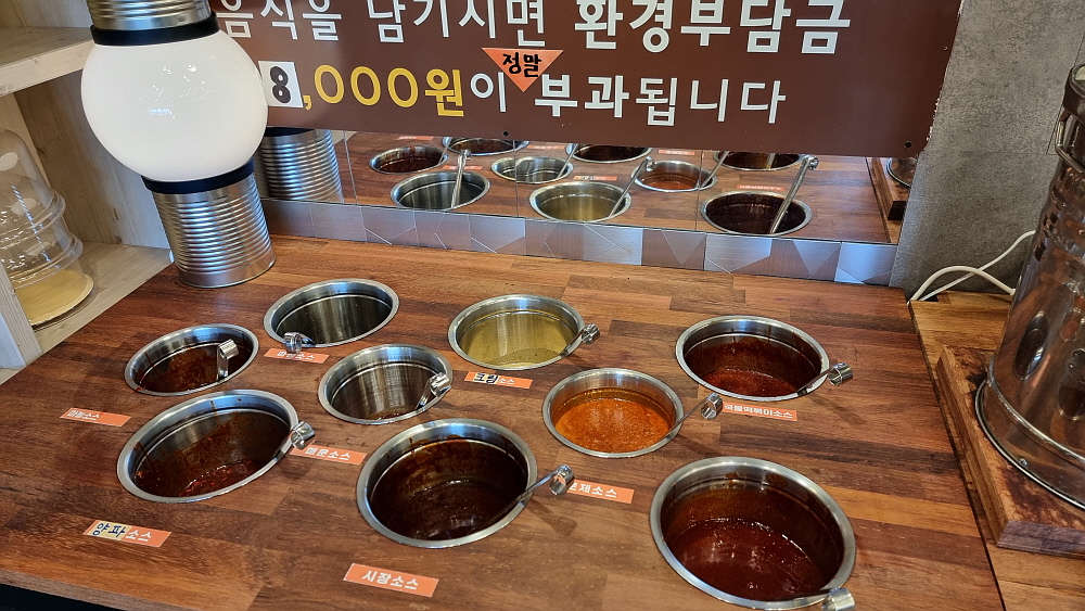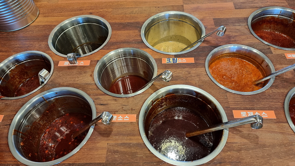 이번에 가서 알게 된 사실인데 여기는 푸페식으로 계속 음식을 갖다 먹을 수 있는 방식이란다. 주력인 돈가스를 많이 튀겨 놓은 것이 아니라 적당량을 계속 즉시 만들어 내어 놓는 정성도 가지고 있다고 했다. 이렇게 맘껏 먹으면서 성인 한 사람이 12,000원이면 아주 좋은 가성비라 하겠다. 일단 식당 안에 들어가면 자리를 잡고 나서 본인이 먹을 음식들을 셋팅해야 한다. 떡볶이를 먹을 사람이라면 떡 종류도 고르고, 토핑도 고르고, 양념과 양조절도 본인이 할 수 있다. 물론 물을 넉넉하게 잡으면 라면사리도 넣어 먹을 수 있다. 이런 비슷한 방식의 식당이 있지 않던가?