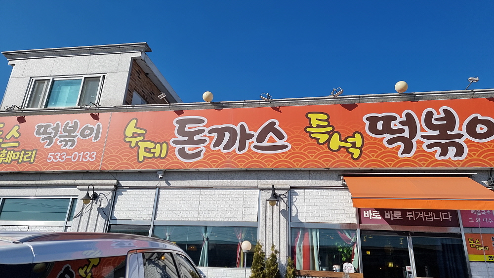 43번 국도변에 있는 이집은 지나면서 엄청 오랫동안 봐온 곳이다. 간판에 적힌 메뉴가 돈가스와 떡볶이라는 것 때문에 한동안 큰 관심을 두지 않았다. 둘 다 그닥 좋아하는 음식이 아니기 때문이다. 하지만 누군가 그랬다. 푸짐하고, 가성비가 좋아 점심 시간에는 자리가 나지 않을 정도로 인기가 있다고 말이다. 그래서 확인 차 한 번 가보기로 했다. 거기에 떡볶이를 즉석으로 만들어 먹는다니 시중에 있는 자극적인 단짠맵이 아니라 직접 구수하게 만들면 될 것 아니냐는 속셈도 있었다. 아무튼 두 번이나 헛탕을 치고 나서야 드디어 입성에 성공했다.