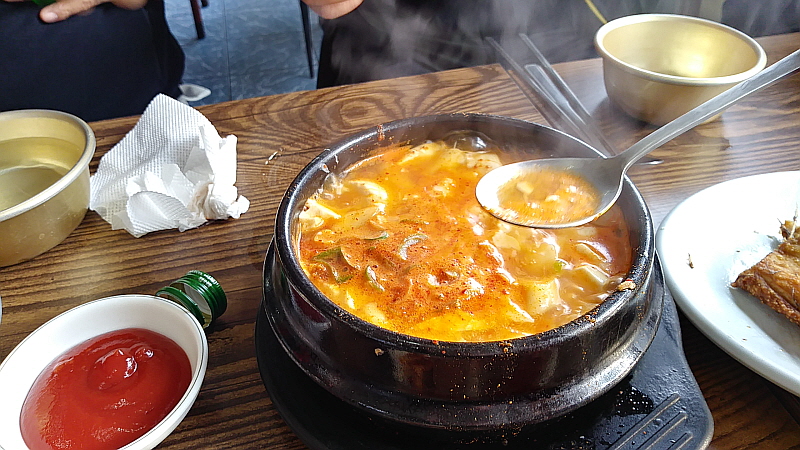 개인적인 취향 탓 일 수 있도 있지만 어쨌든 나는 별로 손이 가지 않았다. 그래서 서브 메뉴로 주문한 것이 순두부 찌개와 두부김치였다. 개인적으로 내 생각엔 막걸리와 가장 잘 어울리는 안주는 사실 김치라고 본다. 거기에 한 단계 업그레이드 한 것이라면 김치를 보슬 보슬 잘 볶아서 두부와 함께 먹는 것이리라. 순두부 찌개 역시 별 것 들어가는 것 없이 늘 입맛을 당기는 가장 서민적인 음식 중에 하나고 동생 하나가 원해서 주문한 계란 말이 역시 언제든 집에서 쉽게 먹을 수 있는 음식이다. 하지만 이런 정겨운 음식이 돈을 내고 먹는 식당에서 만나면 또 그렇게 반가울 수가 없다. 오래된 친구를 우연히 식당에서 만나는 것 같은 느낌이다.