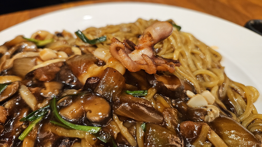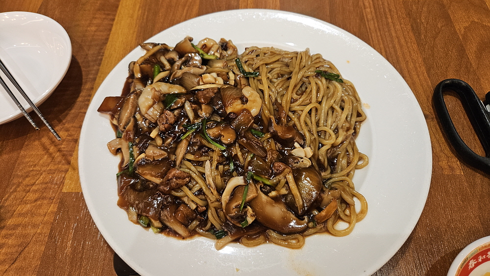 그런데 막상 음식이 나오고 보니 우리가 흔히 먹었던 동네 메뉴와는 사뭇 다르다는 것을 알게 되었다. 쟁반짜장이란 것은 그냥 짜장보다 더 크고, 더 달고, 뭔가 내용물이 더 들어가면서 비싼 메뉴인데 여기는 가격도 같고, 양도 비슷하고, 내용물도 별반 다를 것이 없었다. 유니짜장과 비교해도 더 달고, 기름지고, 윅으로 볶은 향이 덜 나는 것 같았다. 글쎄 이런 것을 뭐라고 표현할까... 유니짜장보다 맛이 덜하다고 밖에 할 수 없을 것 같다. 쟁반짜장이 더 고급진줄 알고 주문한다면 분명 실망할 수 있다. 반면 유니짜장은 일반적인 짜장면에 더 가까웠다. 유니라는 말이 재료를 아주 잘게 썰어서 내놓은 뜻이라 알고 있는데 그렇게 작게 자른 편도 아니었다. 그러니까 그냥 간짜장이라 보면 더 말이 될 것 같다.