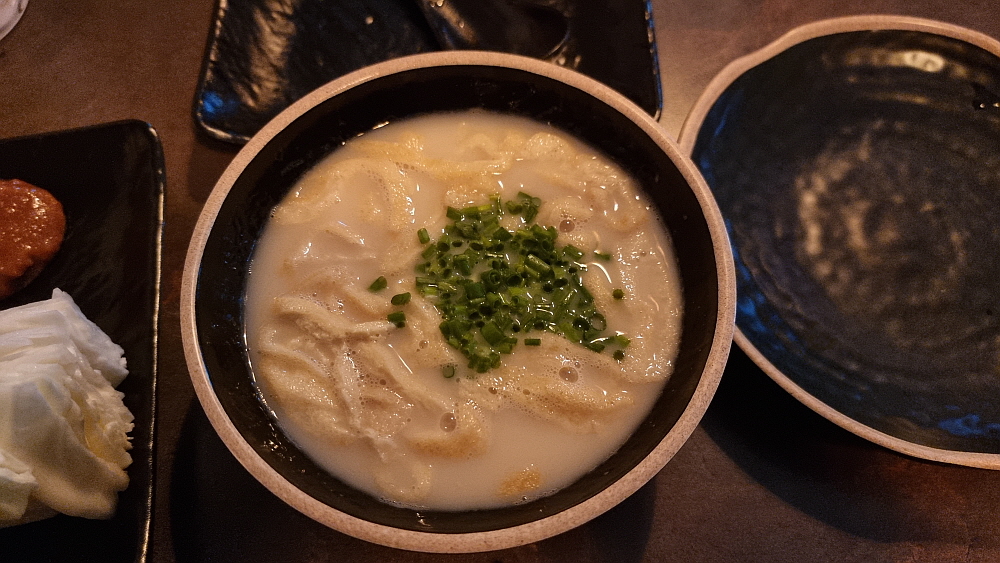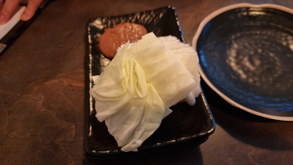 우리는 유부시루라는 국물과 꼬치 세 개를 주문했다. 이렇게 단촐하게 주문해도 양배추를 일본식 된장양념에 찍어 먹을 수 있는 기본찬은 준다. 평소엔 양배추 잘 쳐다보지도 않는데 이런 식당에 오면 이상하게도 자꾸 집어 먹게 된다. 이상한 일이다. 일본식 된장은 짠맛과 단맛이 적절히 조화된 미소 비슷한 맛이난다. 일본식에서 요즘 우리나라 사람들이 가장 잘 먹는 것은 바로 양주를 조금넣고 희석한 일본식 칵테일인 하이볼이 아닌가 싶다. 여기도 일식 주점이라 그런지 하이볼이 입에 착 붙는 것이 참 맛이 좋았다.