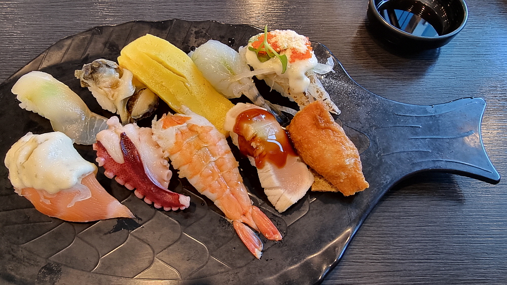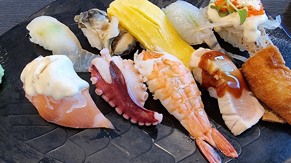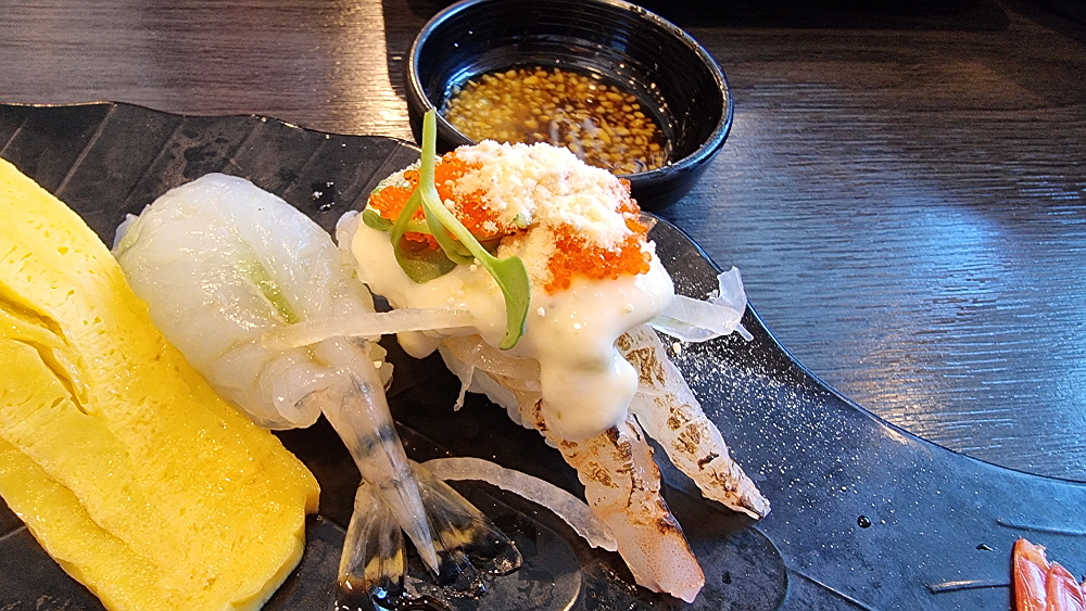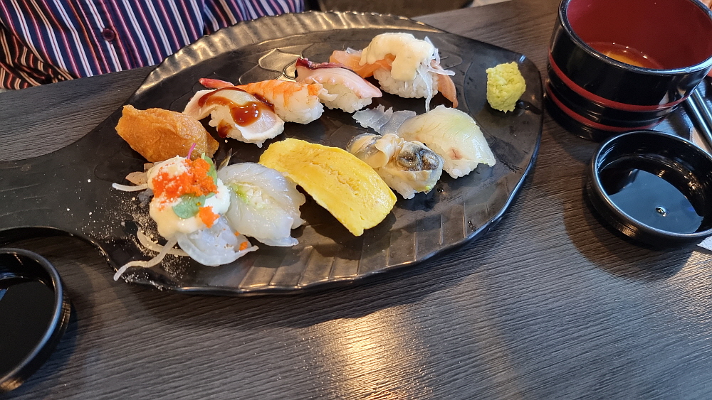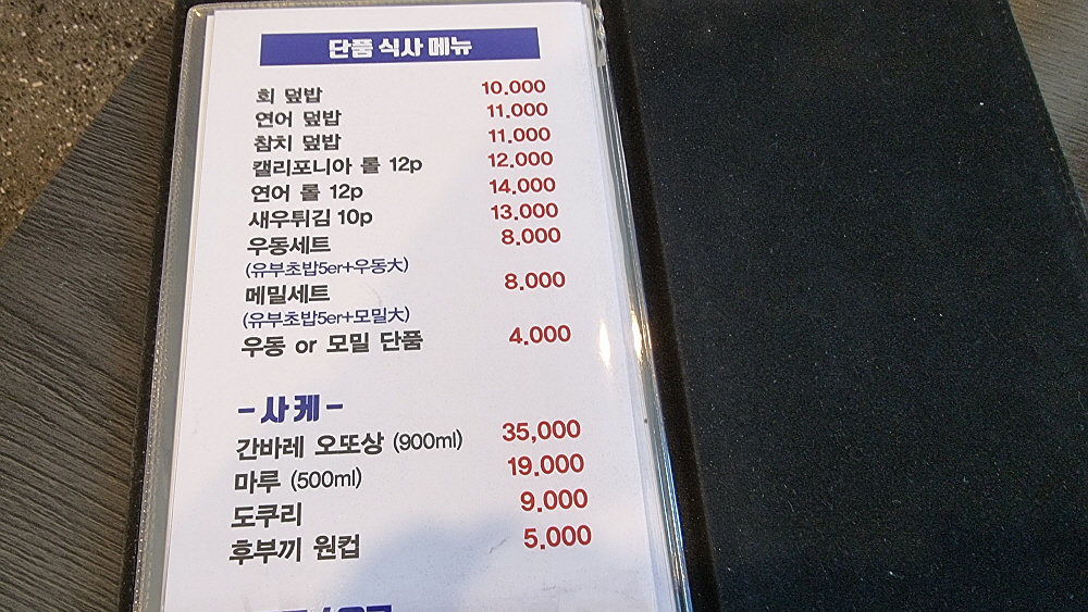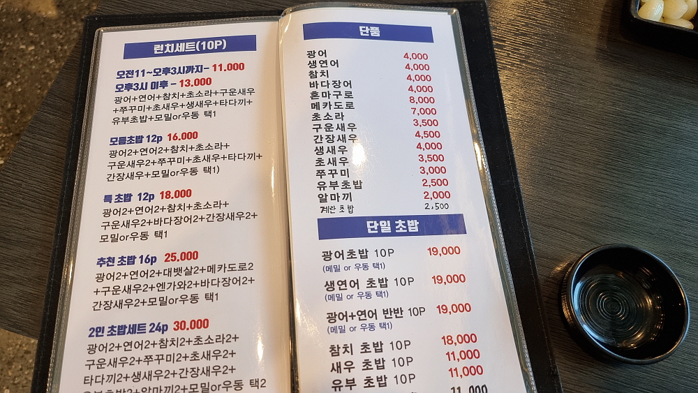 전체적으로 가격이 조금 저렴다는 느낌이었다. 간바레 오또상이란 사케도 900ml 짜리 큰 술이 35,000원이면 나름 합리적인 가격이 아닐 수 없다. 아무튼 우리의 점심 특선은 이렇게 시작되었다. 초밥이 열 개이고, 더운 날을 고려해 주문한 소바가 작게 하나 나왔다. 초밥을 보니 값이 좀 나가는 생선은 하나가 있고 나머지는 다른 재료들을 사용한 조금은 가벼운 느낌의 스시였다. 메뉴판을 보니 생선초밥은 따로 주문을 받는다. 그런데 역시나 값이 이런 세트와는 다르게 비싸다. 예전엔 스시하면 모두 생선만 나왔는데 이젠 가격을 저렴하게 하는 대신 이렇게 다른 재료들을 사용하는 곳이 많다.
