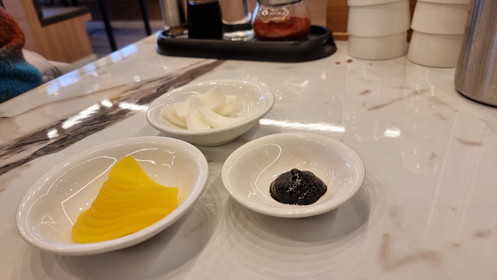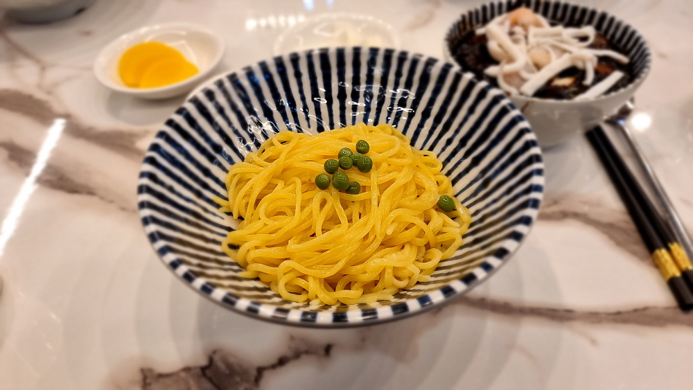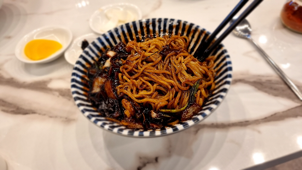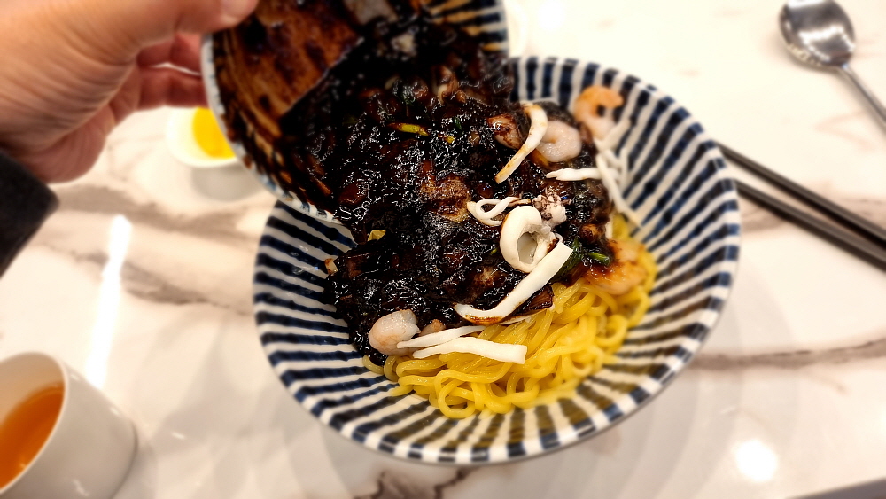 점심을 먹기 위해 간 것이기 때문에 우리는 차돌짬뽕과 간짜장을 주문했다. 요즘은 짬뽕에 해물을 많이 넣거나 이렇게 차돌박이를 넣어 수준을 업그레이드 한 것이 유행이다. 사람에 따라 취향이 다르겠지만 개인적으로 그냥 짜장면보다 항상 간짜장면을 먹는 편이다. 노멀한 짜장면이 좀 더 부드럽고, 모이스쳐 하다면 간짜장은 꾸덕하지만 양념의 맛이 강하고, 재료들이 살아 있어 식감이 좋다고 생각한다. 그거야 어디까지나 자기 자신의 선택이긴 하다. 특이한 것은 간짜장의 소스 위에 하얀 삶은 오징어들이 얹어 있었다는 점이다. 이런 비주얼은 또 처음이네...