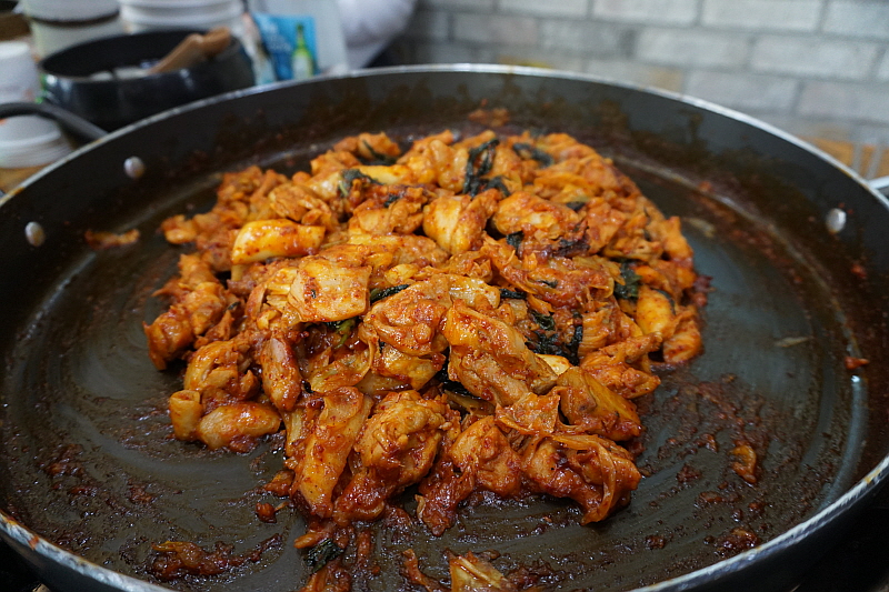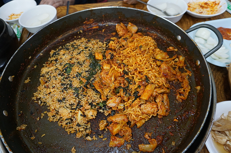 가는 면발에 진한 메밀의 향까지 전문가적인 품격이 살아 있는 제대로 된 막국수 맞았다. 이런 귀한 맛을 여기서 보게 되다니 오늘은 정말 운이 좋다는 생각뿐이다. 면이 툭툭 끊어지는 것이 메밀의 함량이 듬뿍 들어간 막국수 였고, 특유의 알싸한 식감도 바로 그 맛이었다. 다만 왜 그런지 양념이 좀 너무 과하다는 느낌이었다. 나에겐 좀 매웠다. 하긴 포천의 철원 막국수도 양념이 센 것으로 유명하니 이런 것도 일종의 컨셉일 수 있다. 면이 너무 좋아 조금은 양념이 센 느낌이었지만 만족스러웠다. 내가 그렇게 막국수에 심취하고 있는 사이 우리 식탁은 라면 1개, 볶음밥 1개 라는 특이한 추가 주문이 이어졌다. 라면과 밥을 동시에 볶다니 이런 방식은 어디에서도 본적이 없다.