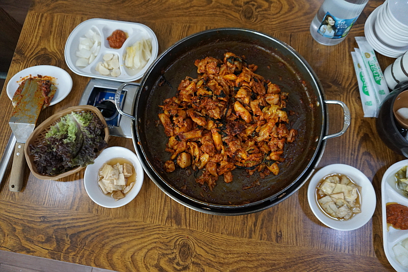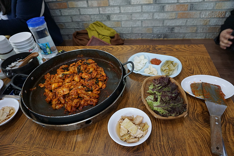 커다란 팬 위에 먹음직 스럽게 익은 닭갈비는 우리의 젖가락을 기다리고 있었다. 이렇게 아름다운 장면이 또 있을까 싶을 정도로 그 자태와 빛깔이 영롱하기까지 했다. 닭갈비는 일행 중 한 사람의 말처럼 누구나 좋아하고, 특별히 불판 위에 올려 굽는 고기처럼 번거롭거나 연기가 나지도 않으면서 고기 먹은 느낌은 살려 주는, 그래서 단체 회식에서는 그저 자연스럽게 찾아가게 되는 그런 아이템이 아닌가 한다. 사실 낮에 이렇게 거하게 닭갈비를 먹은 적은 별로 없다. 대부분 저녁 술자리에서 한 잔 하면서 먹어봤다. 그래서일까? 닭갈비하면 음식이라는 생각보다 안주라는 생각이 더 빨리 떠 오른다.