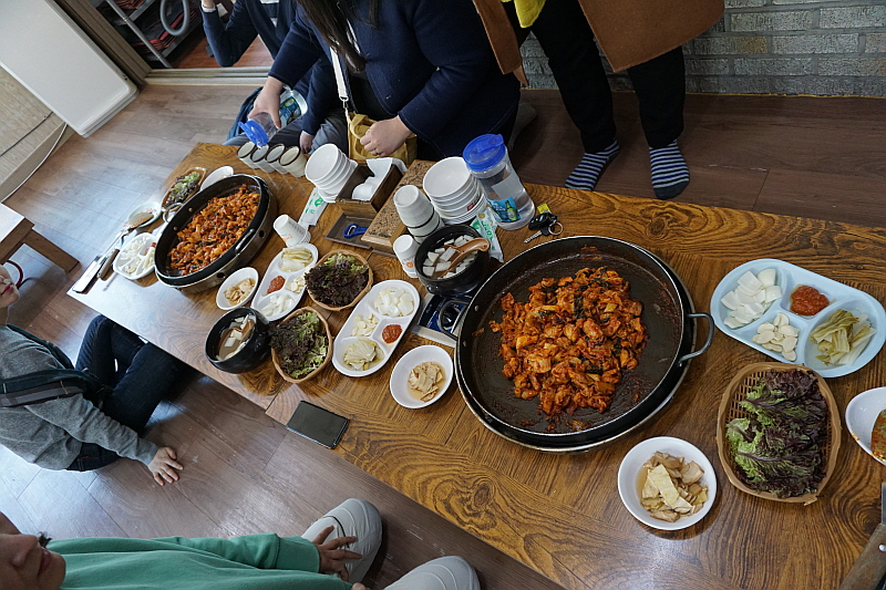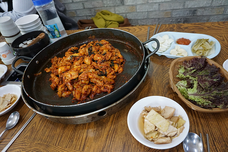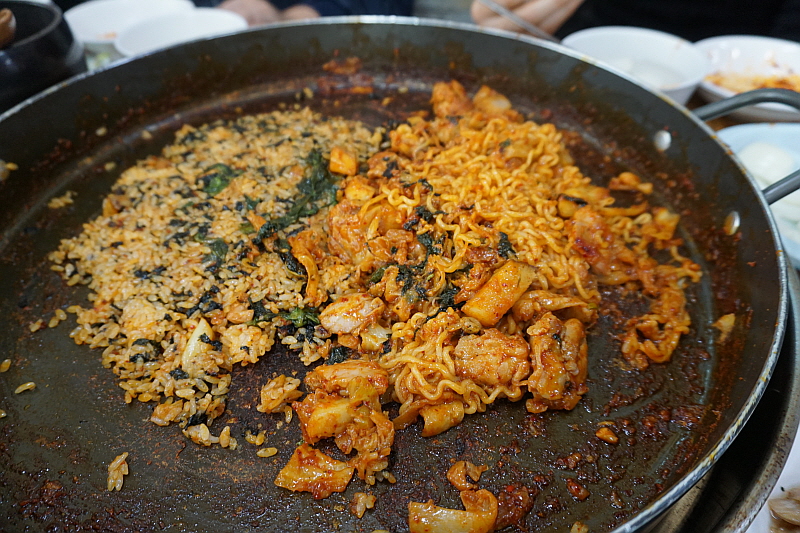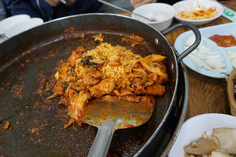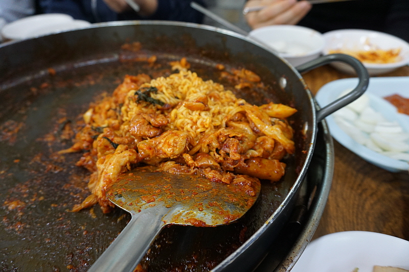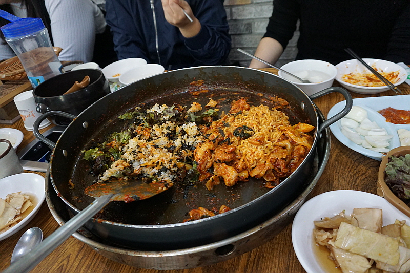 그런데 막상 볶아 보니 잘 안 어울리는 것 아닐까 싶은 처음 예상과 달리 무척 자연스러우면서 푸짐한 추가 메뉴가 되었다. 미리 익혀오는 라면이 바로 신의 한 수 였다. 거기에 기름 양념이 흥건한 팬 위에서 직접 볶는 밥의 맛이란 따로 말하지 않아도 다들 아는 그래서 더 입맛 다시게 만드는 바로 그것이다. 닭갈비로 일가를 이룬 집답게 이곳은 닭갈비에 관한한 전문가 적인 포스가 물씬 풍겼다. 다만 내겐 좀 달다고 할까? 그 달달함이 좀 심하다 싶은 조금만 덜 달면 좋겠다는 생각이 드는 조금의 아쉬움은 있었다. 그런데 뭐 요즘 어디가나 이 정도 단 것은 달다는 축에도 들지 못하니 그걸 타박하는 것도 아니긴 하다. 아무튼 참 맛나고 즐겁고, 헤어지기 아쉽고 그런 복합적인 감정과 만족이 함게 하는 추억의 점심만찬이었다. 역시 본고장은 다르구나 싶은 그런 감동! 참 좋았다.