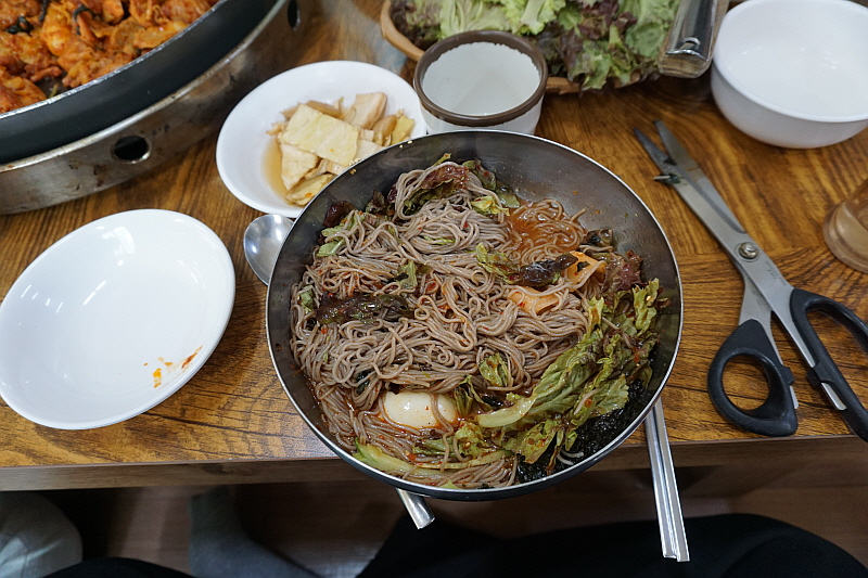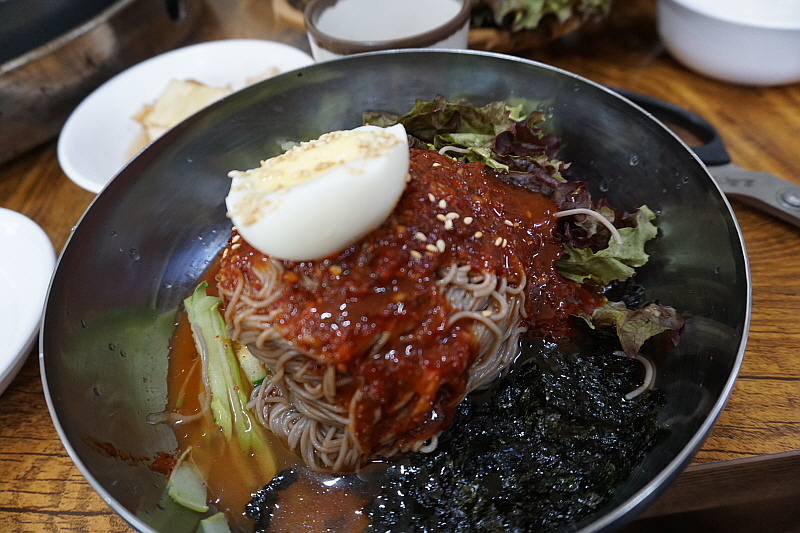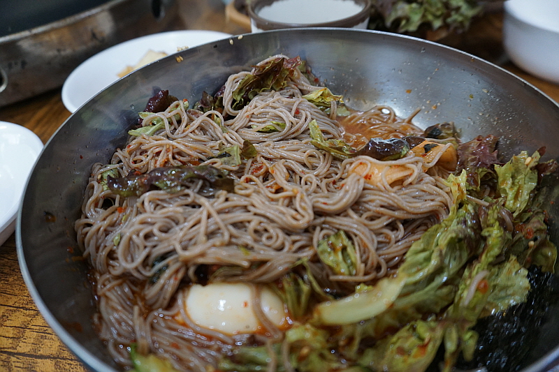 하지만 다들 그렇게 닭갈비에 심취해 있을 때 나는 다른 그림을 그렸다. 그렇게나 좋아하는 나의 최애 아이템인 막국수를 먹어 보기로 한 것이다. 여기까지 와서 막국수의 메밀향을 맡지 않고 간다는 것은 정말로 앙꼬 없는 진빵이나 마찬가지이다. 얼른 막국수를 주문했는데 막상 하고 보니 여긴 물막국수니 비빔막국수니 하는 종류가 없었다. 그저 한 가지 막국수 뿐이었다. 보통은 이런 단촐함 속에 전문가의 숨결이 서려있다. 분명 여긴 막국수도 맛집일 것이다. 벌써 식탁 위에 나와 있는 이 녀석을 보자마자 그런 내 생각이 맞구나 싶었다.