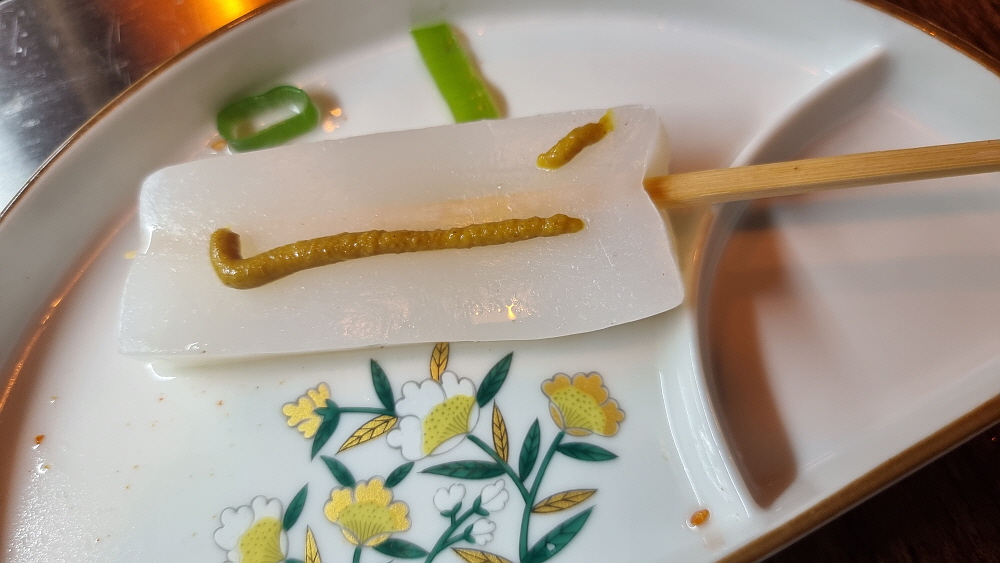 푹익은 무는 오뎅의 육수를 듬뿍 담고 있어 마치 육수주머니를 먹는 기분이다. 거기에 시원한 무의 식감도 살아 있어 정말 좋아하는 오뎅 종류다. 그냥 먹어도 맛있지만 거기에 겨자를 발라 먹어도 그 맛이 그만이다. 이집은 우리나라에선 보기 드문 곤약도 오뎅에 들어있다. 씹는 식감이 탱탱한 밀가루 반죽 같은데 묘한 담백함과 감칠맛이 있다. 그래서 일본 사람들이 곤약를 그렇게도 좋아하는 모양이다. 물론 오뎅 본연의 맛도 정말 괜찮았다. 하긴 당연한 일이다. 이집은 간판부터 그냥 오덴집이 아니던가? 다른 메뉴는 몰라도 오뎅에는 자부심이 있는 가게이니 맛이 좋을 수밖에...