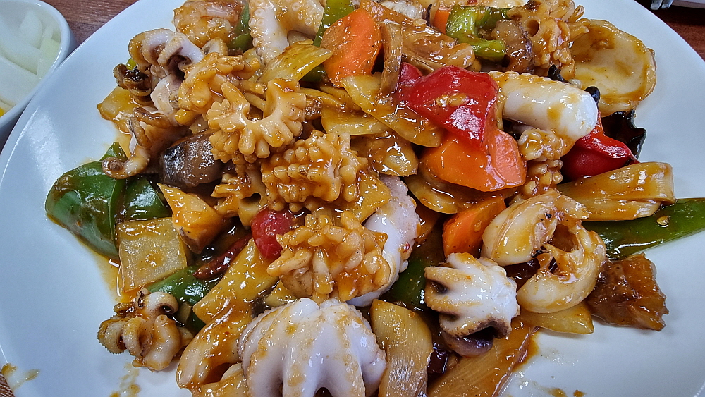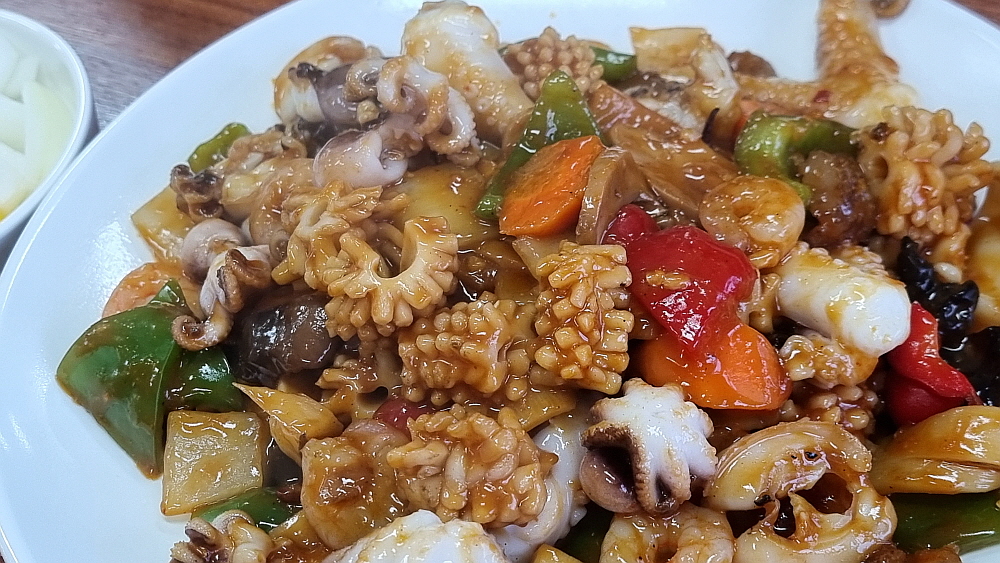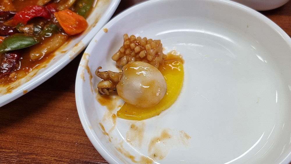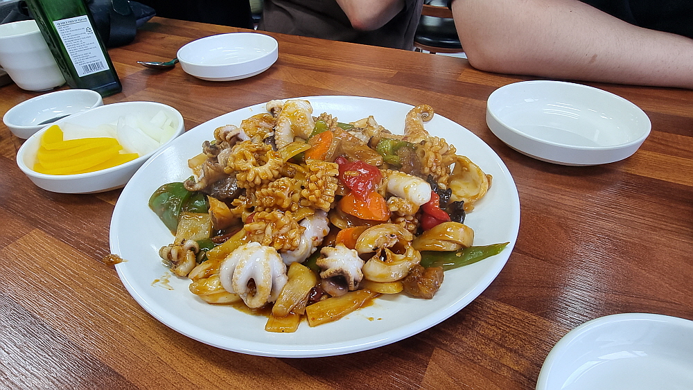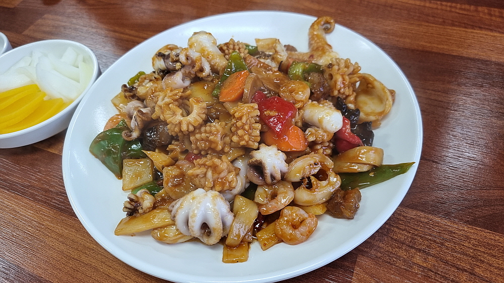 그런데 앉아서 음식을 기다리다 보니 배달과 포장손님이 엄청 많았다. 위치가 위치다 보니 사업체에서 일하는 사람들이 와서 먹기 보다는 사가지고 가거나 배달을 시키는 것 같았다. 아무튼 우리는 해물쟁반짜장과 새우볶음밥 그리고 팔보채를 주문했다. 중국집에서 먹는 고량주도 빼지 않았다. 신기하게도 짜장면이나 볶음밥 보다 팔보채가 가장 먼저 나왔다. 원래 중국요리집에서 코스로 주문하면 이렇게 요리가 먼저 나오고 나중에 식사를 하라고 짜장이나 짬뽕이 나오는 법이다. 그런데 주문을 하고 생각해 보니 이집의 상호가 육해공 짬뽕인데 우린 정작 짬뽕은 주문하지 않았다.