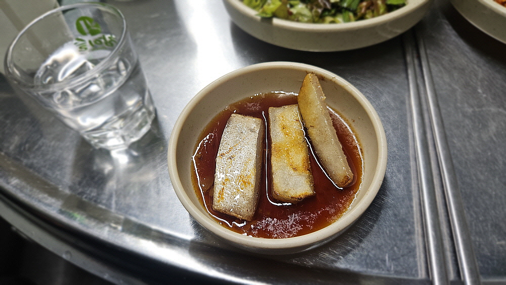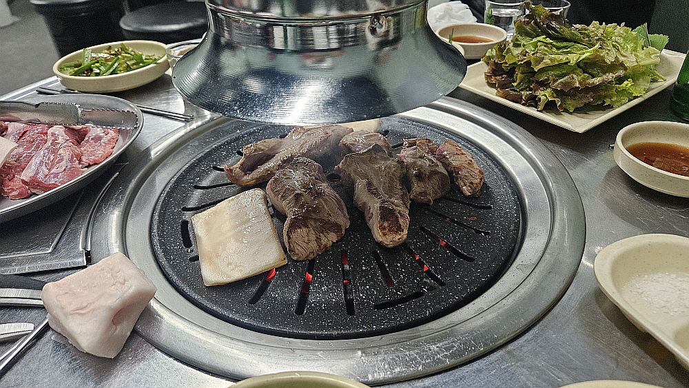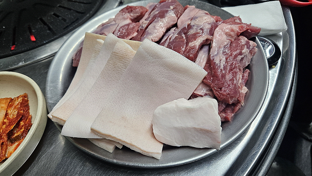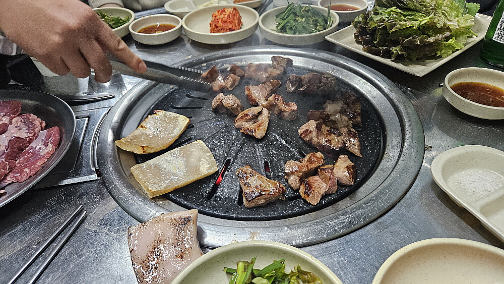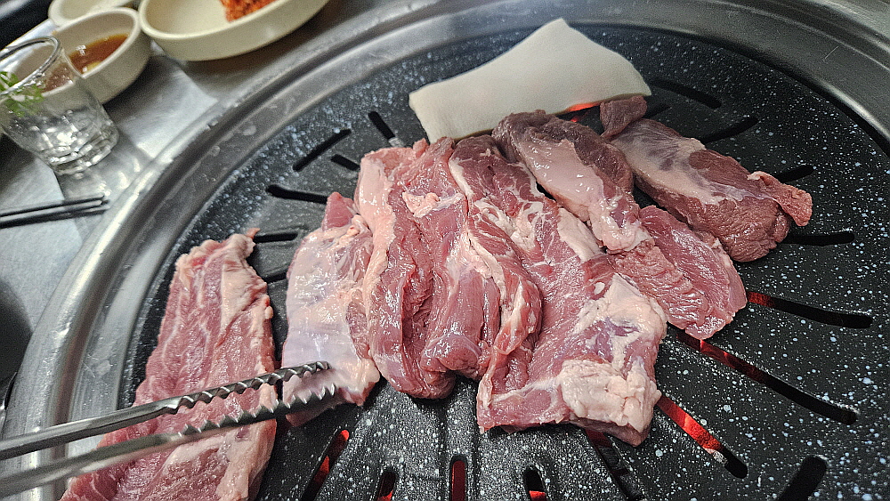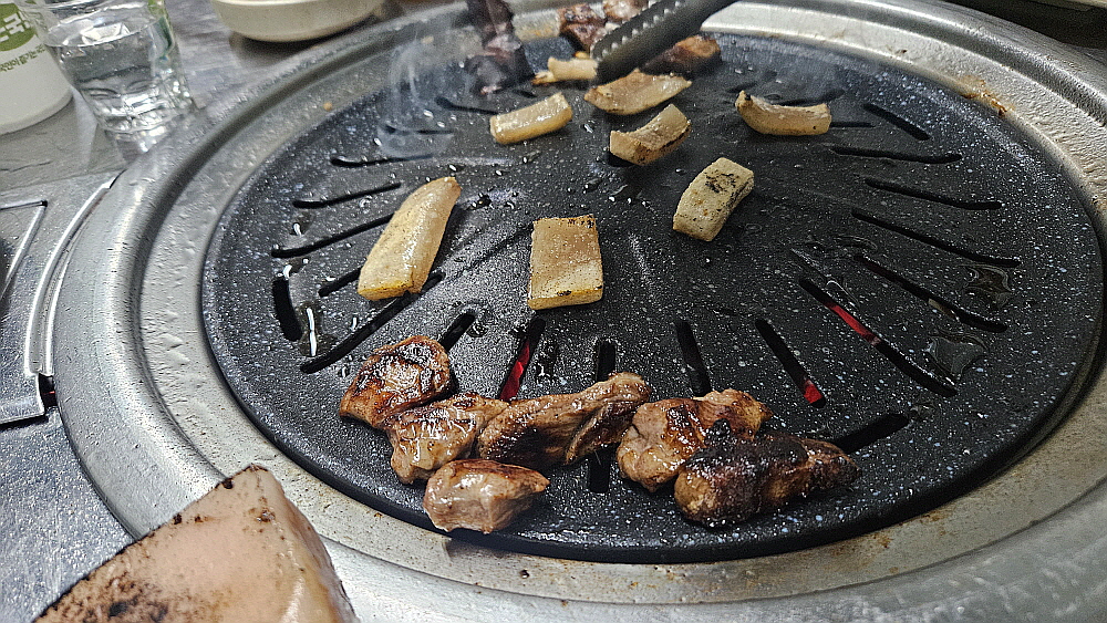 기름기가 거의 없는 고기는 불위에 올리자 마자 "치직~" 소리를 내면서 익기 시작했다. 돼지껍데기는 안으로 휘기 시작했다. 이렇게 돼지살과 불의 만남이 시작된 것이다. 다른 반찬들도 제법 많은 편이지만 이렇게 좋은 고기를 봤으니 젖가락이 반찬으로는 가지 않는다. 그럴 필요가 없는 것이다. 어서 고기가 익기만 기다리면 되는 것이다. 이날 갈매기살도 물론 맛이 좋았지만 다른 압권의 맛이 있었느니 바로 돼지껍데기 살이었다. 이렇게나 신선하고 쫀득한 껍데기를 먹은 적이 있을까 싶을 정도로 아주 맛이 좋았다. 원래부터 껍데기를 좋아하기는 하지만 천상의 맛이라 극찬해도 아깝지 않을 정도의 훌륭한 식감이었다.