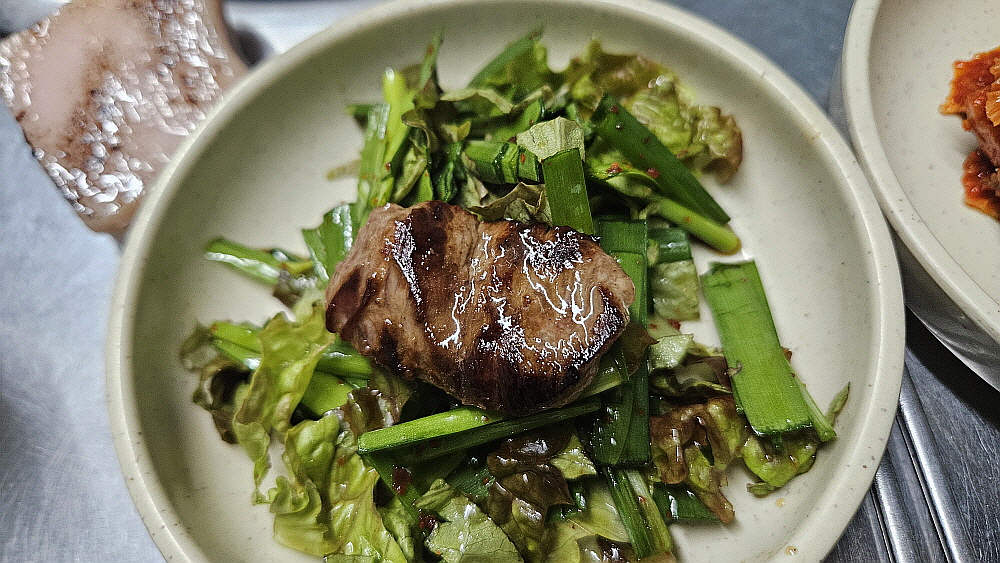 기름기가 없는 부위인데도 희안하게 기름이 잘잘 흐르는 모습으로 익어가는 갈매기살을 보니 역시나 침이 꿀꺽하고 넘어갔다. 서둘러 잔들을 채우고 나에게 올 다음 갈매기살을 기다린다. 이 얼마나 흥분되고, 설레는 기다림인가... 알싸한 소주 한 잔을 목으로 넘기고 바삐 젖가락질을 하여 갈매기 살 한 점을 들어 올렸다. "이 자태를 보아라~" 하는 탄식이 나올 정도로 아름다운 모습이었다. 고기의 식감은 고소하고, 돼지 특유의 향도 있고, 육즙이 씹을 때마다 나오는 전형적인 맛난 고기의 맛이었다. 아마도 이래서 이집의 인기가 그렇게나 높은가 보다. 오랜 세월 한 자리를 지킨 장인의 맛이라 하겠다.