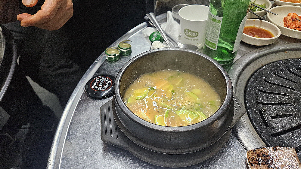 욕심을 내서 아예 껍데기와 갈매기 살을 한꺼번에 쌈에 싸서 먹는 만행도 서슴치 않았다. 이런 맛을 어디에서 다시 볼 것인가? 일단 염치 불구하고 먹고 볼 일이다. 구수함의 극치인 된장찌개가 나오니 우리의 회식은 완전히 무르 익었다. 술잔이 오가면서 말이 없던 사람의 입에서 방언이 터지기 시작했다. 시원한 소주와 맛난 안주의 조합이 이렇게나 사람들을 가깝게 만들어 준다. 서먹하던 처음의 모습들은 간곳없고, 이젠 오래 전부터 알고 지내던 사람들처럼 눈빛만 봐도 웃음이 멈추지 않는다. 이날의 회식은 그런 자리였다. 아주 성공적이고, 맛있고, 흥겨운 자리였다. 그러면 된 것이다. 돼지의 축복인 셈이다.