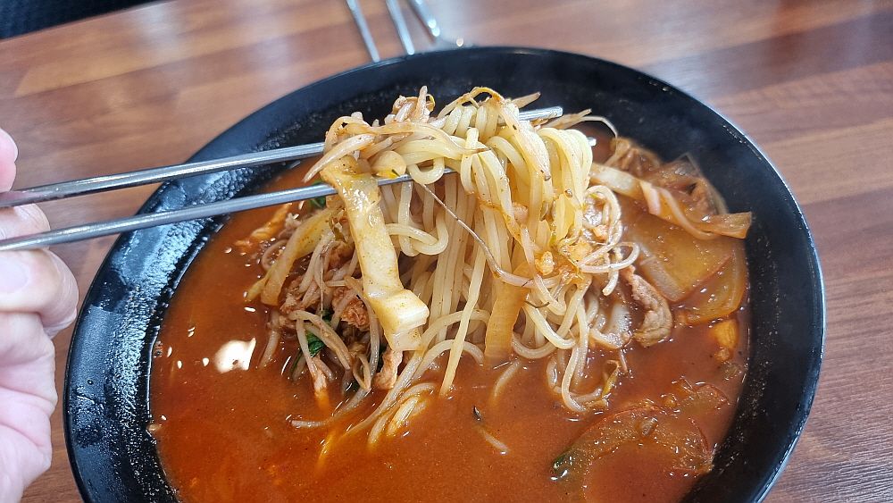 그래서인지 우리 보다 먼저 와서 기다리는 손님보다 우리의 짬뽕이 먼저 나왔다. 이집의 시그니쳐 메뉴인 고기 짬뽕이다. 짬뽕에는 꼭 해물을 넣는 것이 상식이라는 점을 파격적으로 바꾼 메뉴라 하겠다. 고기가 듬뿍 들어간 칼칼한 짬뽕 국물은 마치 소고기 국밥을 먹는 것 같은 생각이 들게 했다. 중국집 짬뽕은 자극적인 맛이 없으면 매력이 사라지는 법! 다소 짜고 매워도 이 강렬한 맛의 유혹을 뿌리치지 못하는 것이다. 적당히 잘 익은 면과 강렬한 짬뽕의 만남은 이미 시작부터 어느 정도 땀이 나고 자극적일 수밖에 없다는 것을 암시하는 것이다.