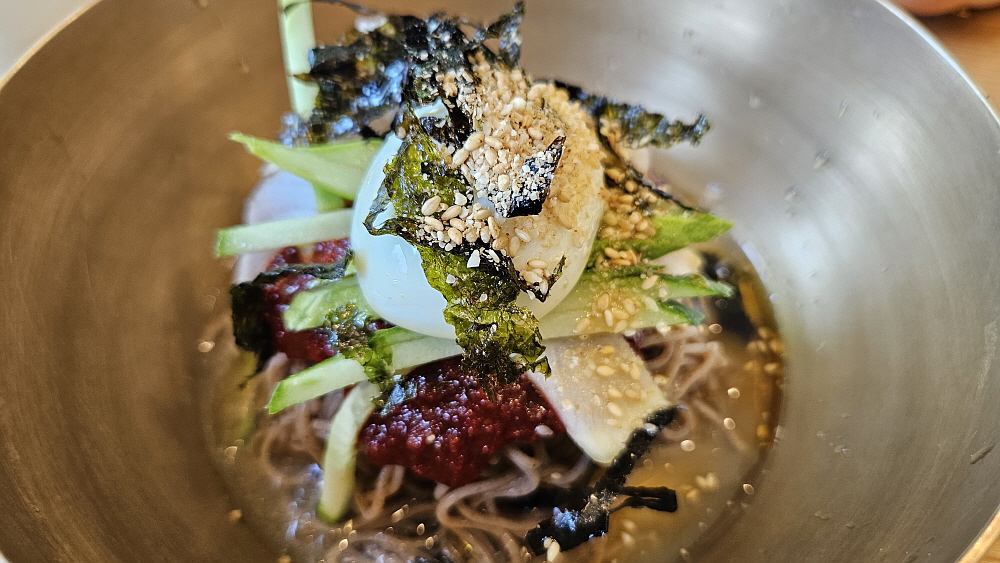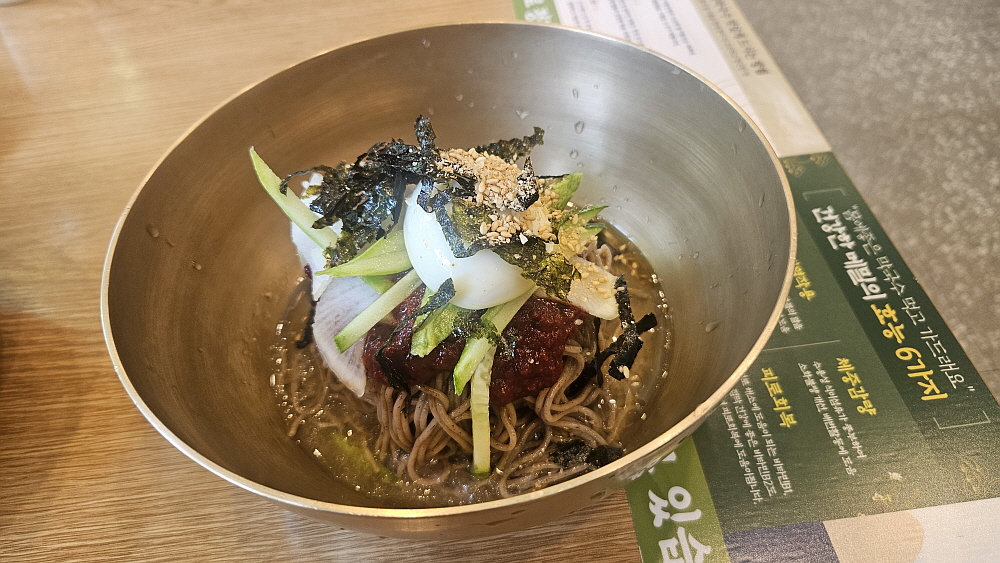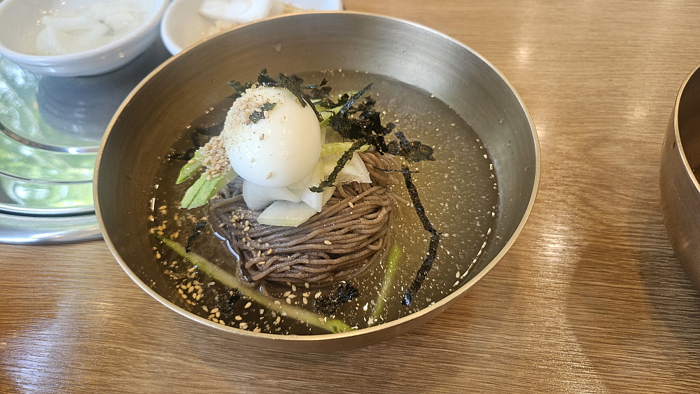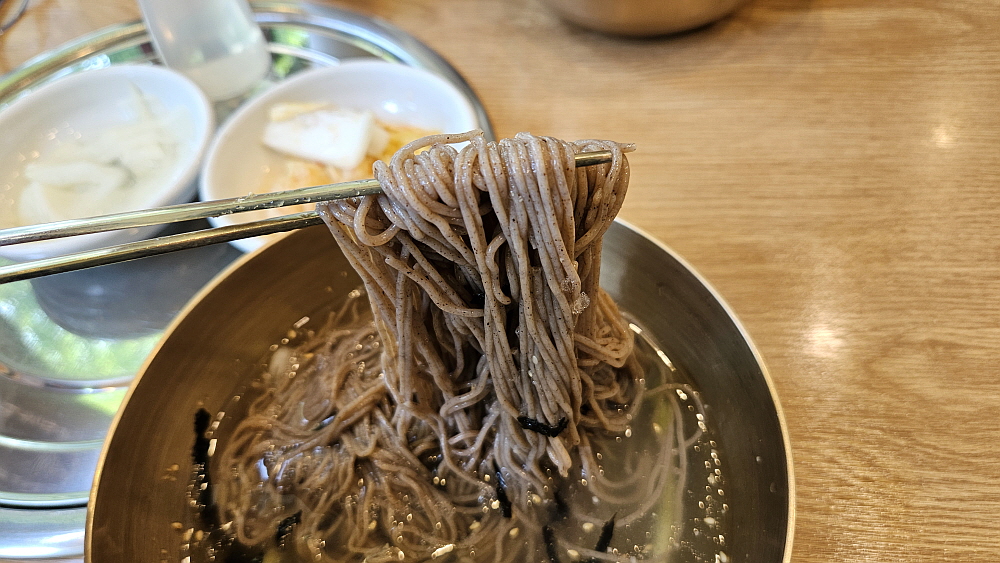 이집은 메밀차와 반찬을 셀프로 가져다 먹을 수 있다. 메밀차가 어찌나 색이 영롱하니 예쁘던지 몇 잔을 먹었는지 모른다. 메밀은 차로도 즐겨 먹는 참 쓸모가 많은 재료다. 막국수라고는 하지만 맛이 거의 평양냉면과 흡사했다. 이런 점에서 보면 가격이 좀 비싸도 이해가 가는 부분이 있다. 과연 비슷한 제조과정과 재료가 들어갈 것 아닌가... 하지만 그렇다면 냉면과 막국수의 차이는 뭐지? 과거부터 그것이 궁금하긴 했다. 주변을 둘러보니 나이 지긋한 손님들이 많았다. 요즘 평양냉면은 젊은층에서도 맛집 투어하면서 자주 간다고 들었는데 아직 막국수는 그런 인기를 누리진 못하는가 보다.