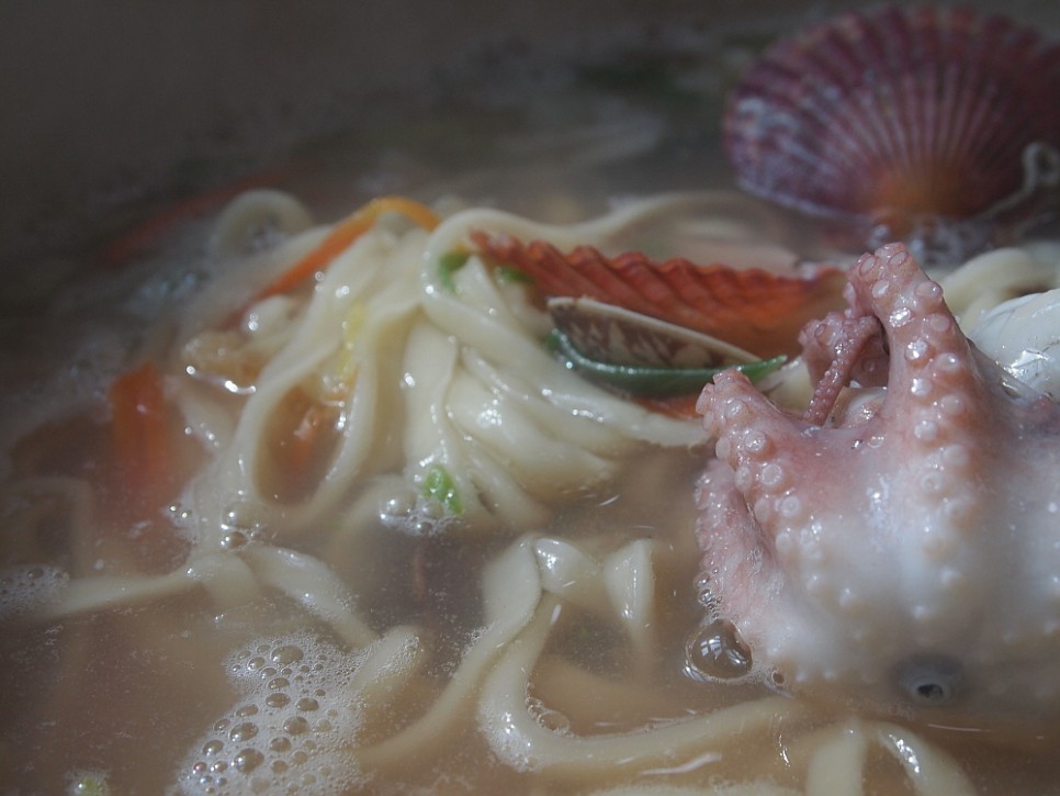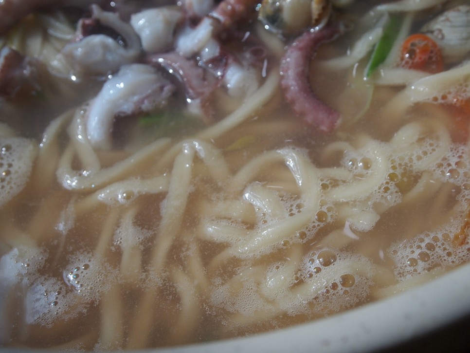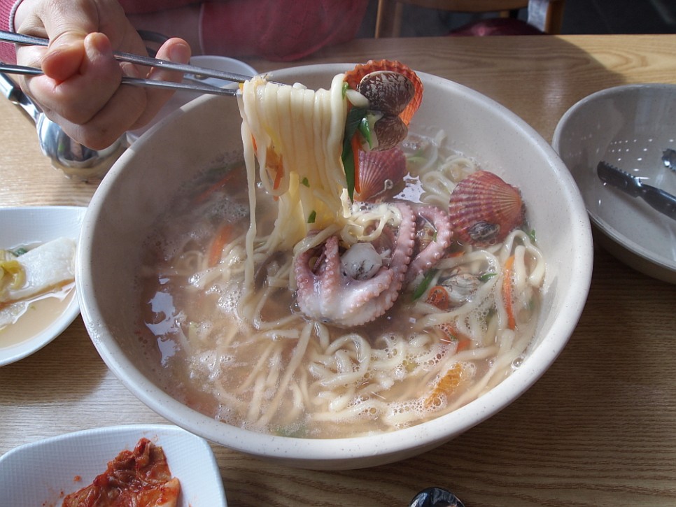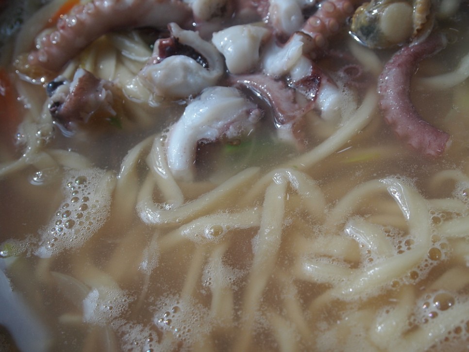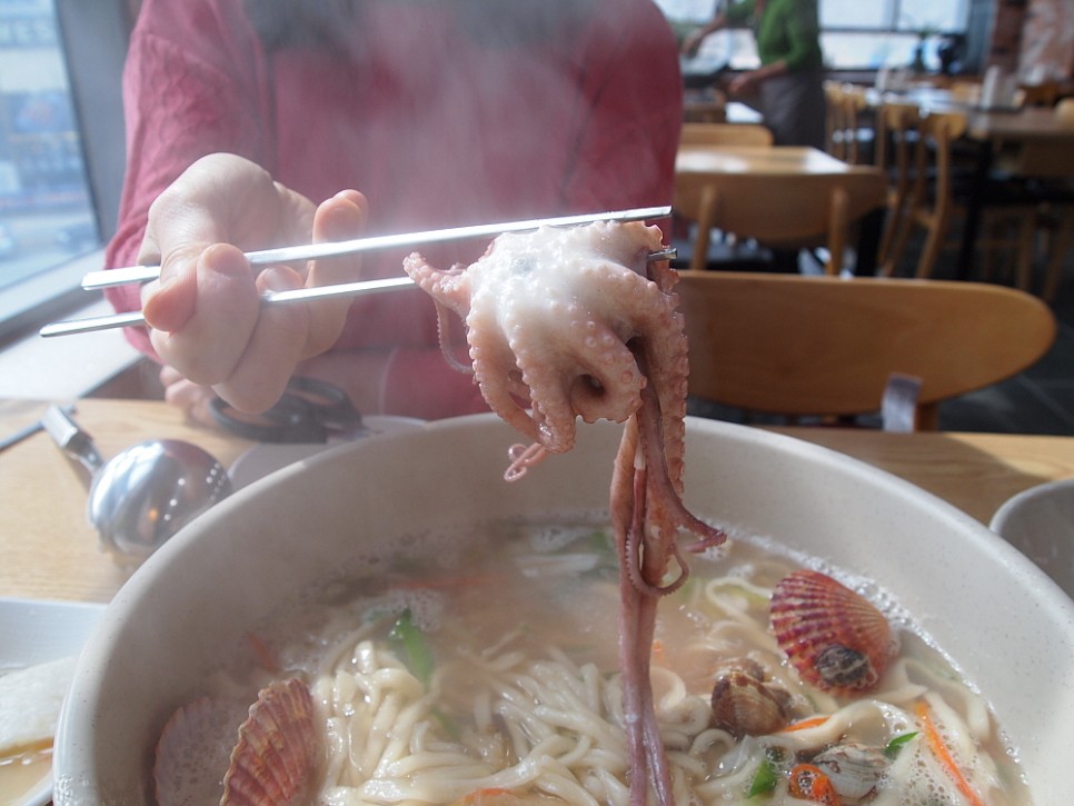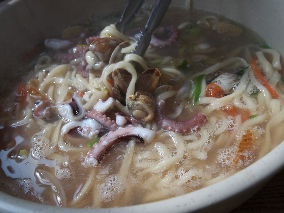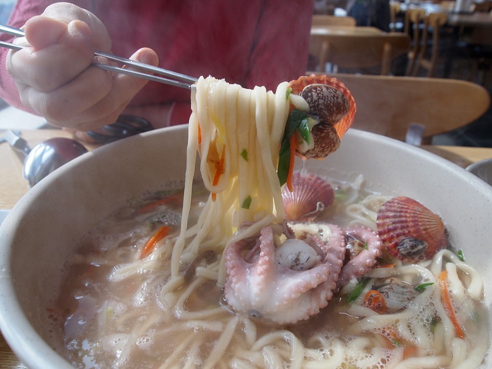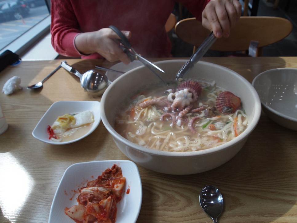 낙지 외에 다른 조개들도 들어 있었는데 칼국수 면을 함께 넣고 끓였는지 국물이 울면처럼 걸죽했다. 솔직히 개인적으로는 이렇게 걸죽한 국물을 그닥 좋아하지 않는다. 최고집 처럼 담백하고, 쫄깃하면서 시원한 국물이 더 좋은데 암튼 여긴 달랐다. 들어간 내용물이 많아서인지 국물에서 오묘한 맛이 났다. 정말 해물 칼국수가 맞았다. 이렇게 먹으니 뭐랄까 식당에서 사먹는 집칼국수의 느낌이라 건강해 지는 기분이 들었다. 담백한 국물인지라 걸죽하지만 많이 퍼 먹었다. 온몸이 뜨근해지는 것이 정말 영양많은 국물을 먹는 것 같았다.