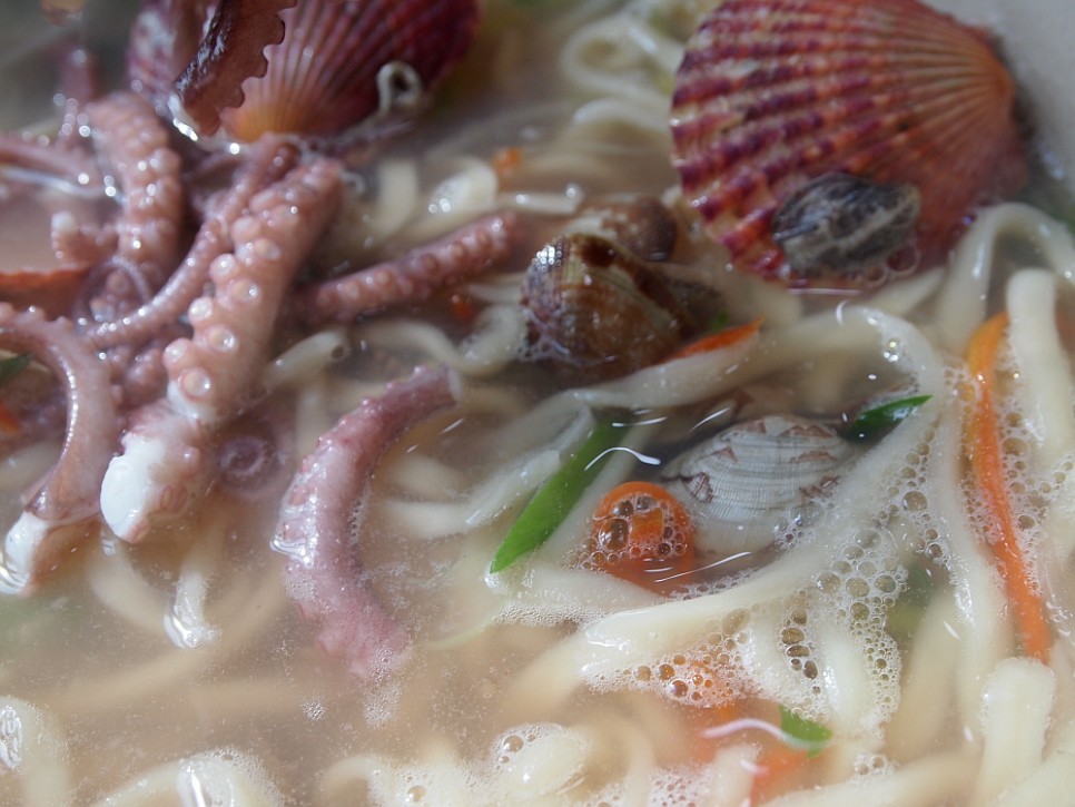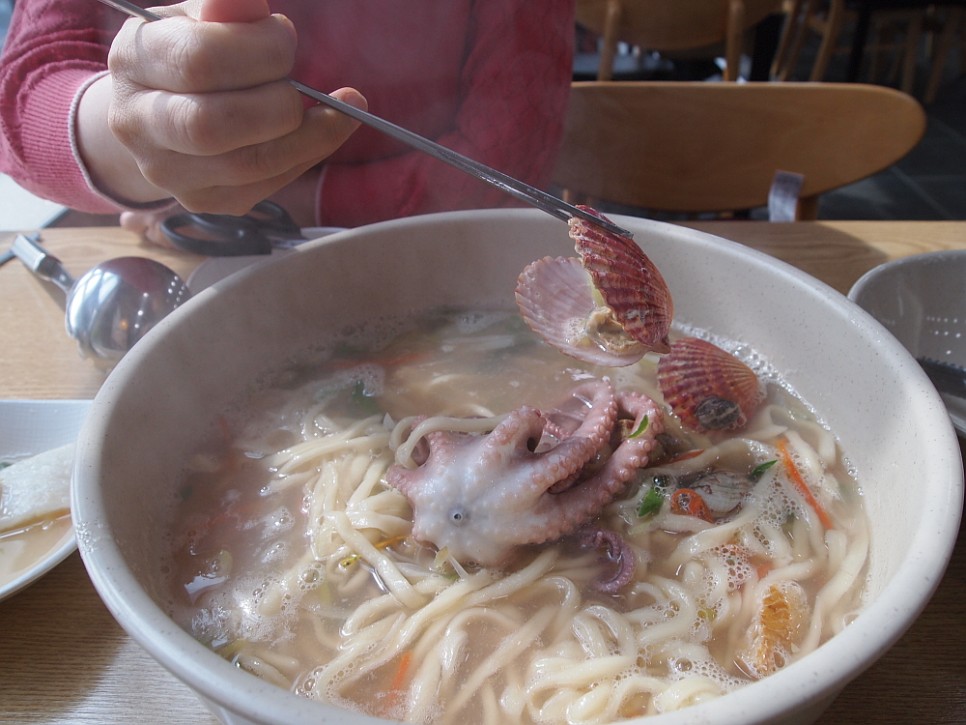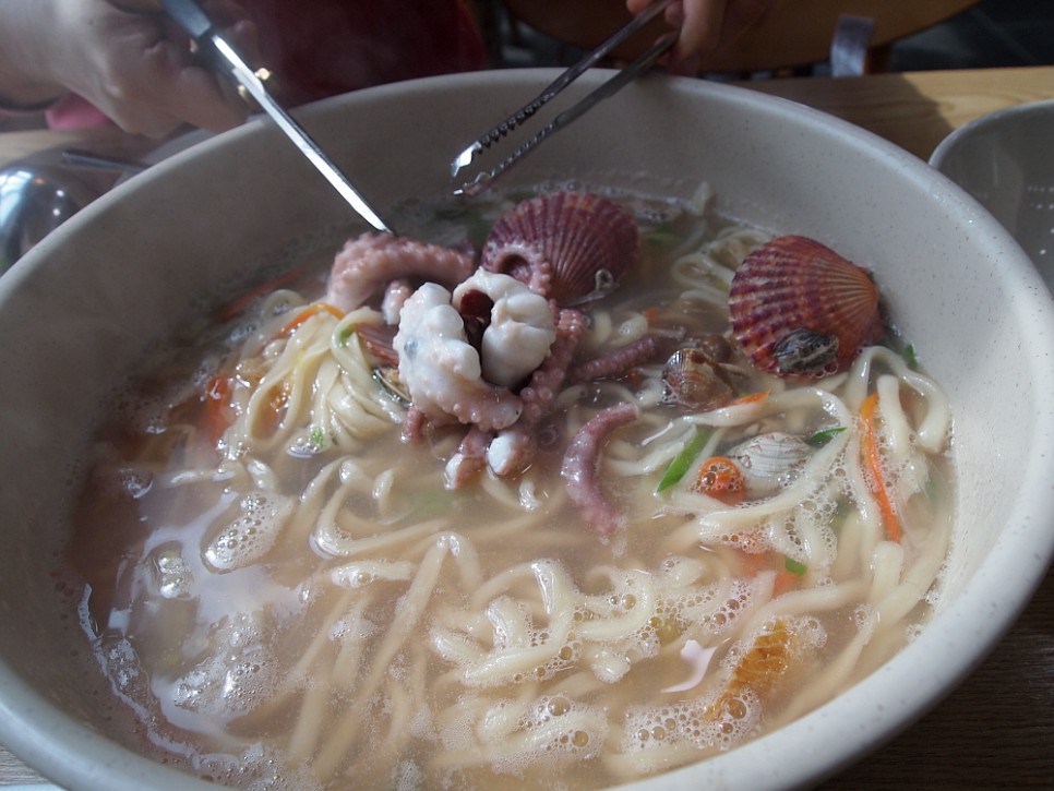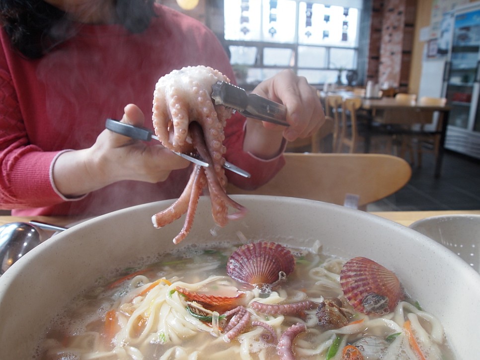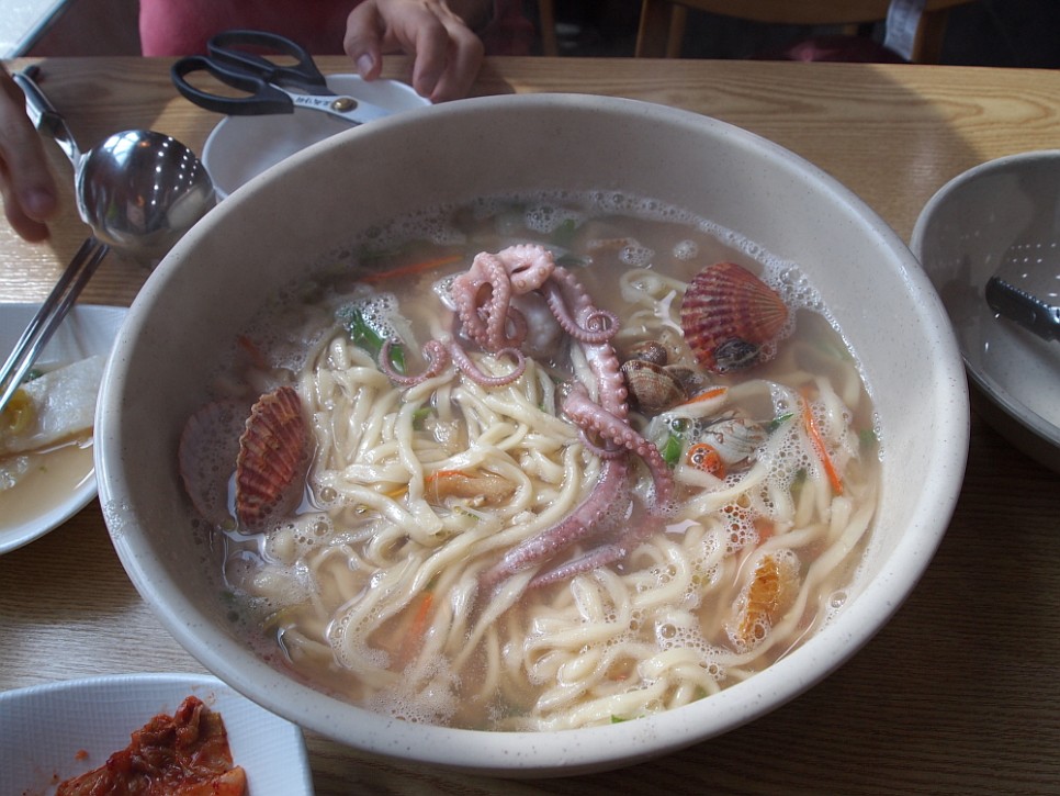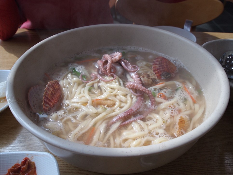 낙지를 워낙 좋아하기 때문에 내가 거의 다 집어 먹은 것 같다. 면은 양보하고 조개와 낙지로 배를 채운 것 같다. 이런 류의 해물 칼국수는 주변에서 흔히 볼 수 있다. 하지만 맛은 천차만별이다. 이날 먹은 칼국수도 다른 곳에서 좀처럼 맛보기 힘든 여기 만의 특이한 맛이 살아 있는 것이었다. 구읍뱃터라는 즐거운 곳에 와서 먹으니 뭐라도 맛나고 행복한 시간을 선사한다. 다음에 다시 오면 새우튀김도 먹고, 다른 집도 가보고 그래야지... 멀지 않지만 행복한 곳이다.