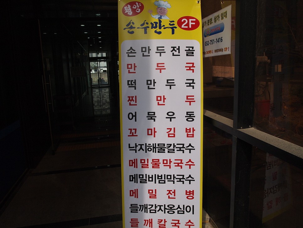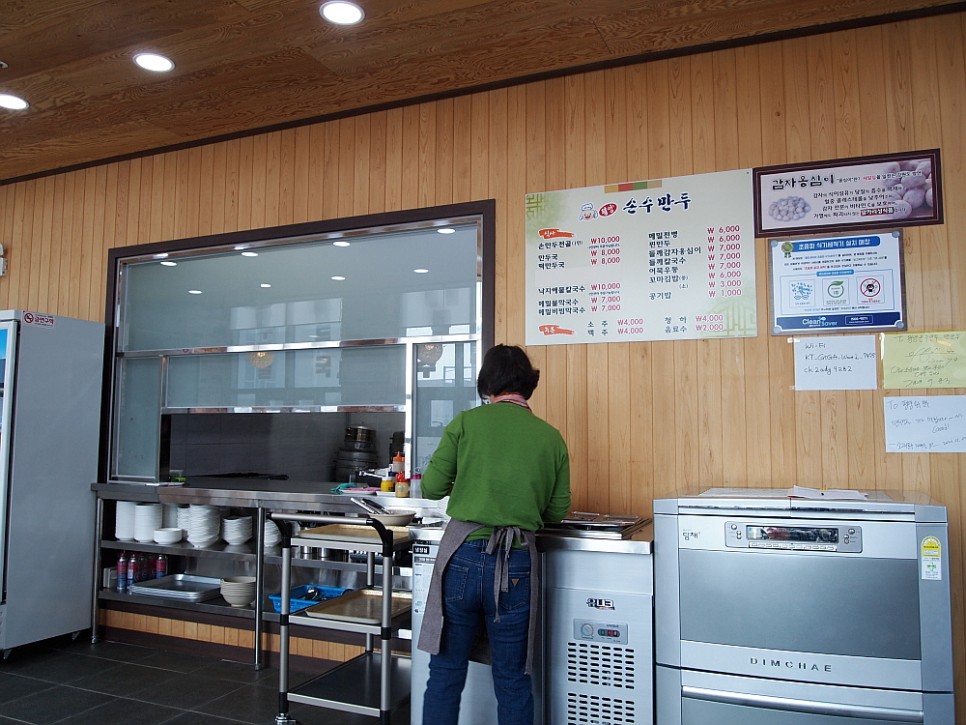 선착장에서 멀지 않은 곳에 있어 눈에 잘 띄는 곳이다. 2층에 있어 근처도 조망할 수 있고, 조용하고 깔끔한 집이었다. 토요일 오후 구읍뱃터는 그래도 사람들이 제법 많았다. 우린 만두 전문점에 왔지만 해물 칼국수를 시켰다. 역시 우리의 칼국수 사랑은 알아줘야 한다. 비록 여기 고기잡이 배는 없지만 그래도 포구니깐 해물이 맛있을 것이란 기대를 안고 주문했다. 시간이 조금 일러 식당 안에는 우리와 또 다른 한팀만이 식사를 하고 있었다.