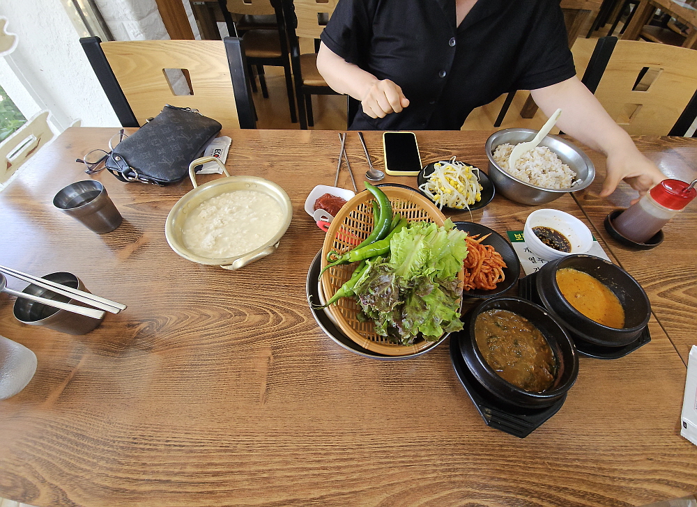 12시가 조금 넘은 시간이었는데 벌써 식당 안은 거의 손님들로 채워져있었다. 동네에서 마실 나오듯 온 것같은 손님들이 많았는데 그만큼 현지인들에게 사랑받는 집이라는 반증이 아닐까 싶다. 보리밥상과 쌀밥상이 있는데 이렇게 더운 여름엔 뭐니 뭐니해도 보리밥이다. 거기에 맛난 반찬들이 나올 것이고, 반찬과 두부를 넣고 대충 고추장에 쓱쓱 비벼 먹으면 가장 건강하다는 한끼 밥상이 되는 것이다. 보리밥은 큰 대접에 담겨 넉넉하게 나온다. 양이 좀 되는 아재들도 이 정도면 불만이 없을 것 같다. 반찬은 강된장과 비지찌개, 무채나물과 콩나물, 열무김치 등등이고 거기에 손두부가 나온다.
