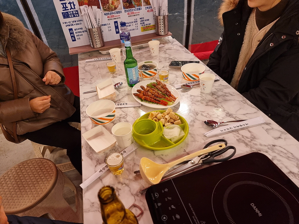 문을 연 포장마차가 절반도 되지 않았다. 확실히 겨울은 낭만포차거리와는 잘 맞지 않는가 보다. 문을 연 가게들도 손님들은 거의 없었다. 하긴 이런 날씨에 여길 찾아와 소주잔을 기울이겠다는 사람은 분명 우리처럼 외지인들이거나 처음 와보는 사람들일 것이다. 그래도 여기까지 왔으니 추억을 만들기 좋은 집을 골라 들어가야 했다. 그래서 우리가 고른 집은 포장마차 거리 제일 앞에 있는 달밤포차였다. 밖에서 보니 포장마차의 인테리어나 안주 구성이 거의 비슷해 보였다. 하긴 그럴 것이다. 여기서 혼자 별개의 행동을 하는 가게는 없을 것이다.