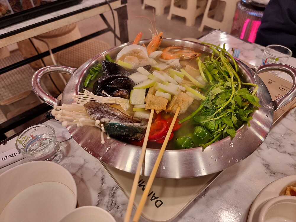 안주가 여러 종류가 있지만 가격은 모두 4만 원이다. 가격이 비싼 편이긴 한데 이런 안주는 사실 잘 보지 못했던 것들이다. 현지에 맞게 만들어진 것이리라 생각했다. 우린 그 중에 추운 날씨를 감안하여 먼저 해물연포어묵탕을 주문했다. 사실 여기 안주 중에서 가장 노멀해 보이는 아이템이기도 했다. 어묵탕이야 어딜 가나 비슷하지만 여긴 연포탕이란다. 낙지가 들어가는 어묵탕은 쉽게 보지 못하는 것이다. 그런데 왜 안주 구성이 이렇게 균일가로 되었을까? 그 이유는 잘 모르겠다.