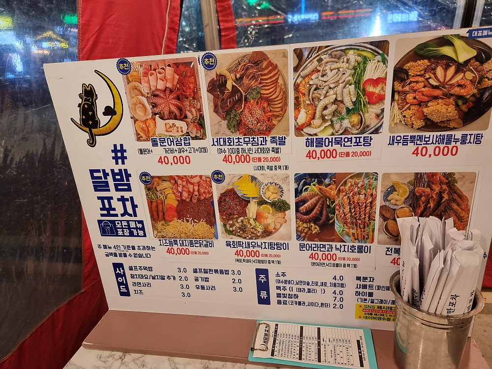 문을 연 포장마차가 절반도 되지 않았다. 확실히 겨울은 낭만포차거리와는 잘 맞지 않는가 보다. 문을 연 가게들도 손님들은 거의 없었다. 하긴 이런 날씨에 여길 찾아와 소주잔을 기울이겠다는 사람은 분명 우리처럼 외지인들이거나 처음 와보는 사람들일 것이다. 그래도 여기까지 왔으니 추억을 만들기 좋은 집을 골라 들어가야 했다. 그래서 우리가 고른 집은 포장마차 거리 제일 앞에 있는 달밤포차였다. 밖에서 보니 포장마차의 인테리어나 안주 구성이 거의 비슷해 보였다. 하긴 그럴 것이다. 여기서 혼자 별개의 행동을 하는 가게는 없을 것이다.