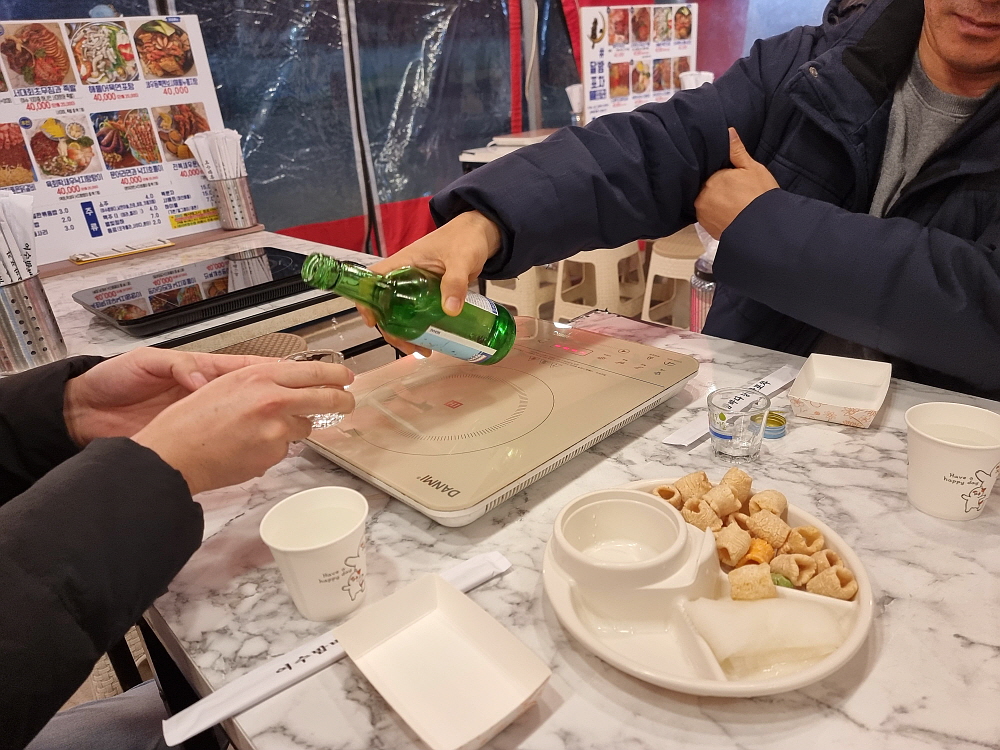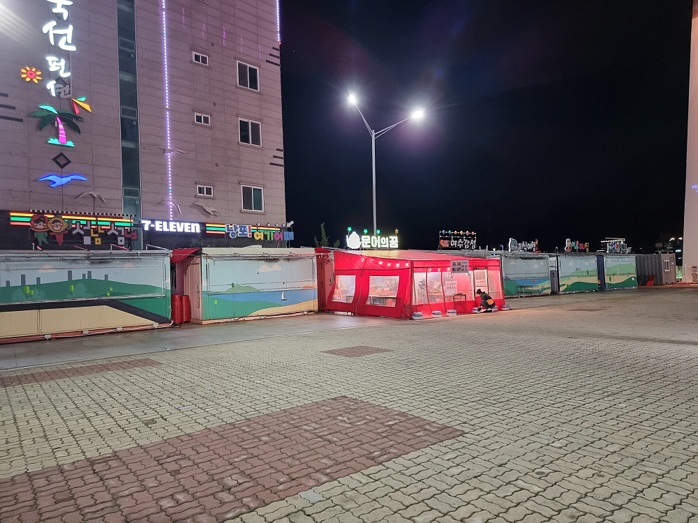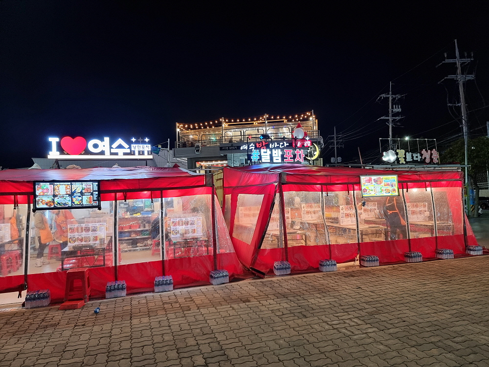 조금 비싸 보였지만 안주 구성은 푸짐한 편이었다. 다만 이미 술들이 거하게 올라 있었기에 안주보다는 다들 다시 술잔을 잡는데 집중하고 있었다. 이러면 굳이 비싼 안주를 더 주문할 필요가 없어지는데 말이다. 그래도 밤바다 소리를 배경으로 좋은 사람들과 어깨를 부비며 여수의 상징인 낭만포차에 앉아 있으니 처음 생각했던 그런 모습은 비스무리하게 나오는 것 같았다. 아마 여름엔 이렇게 편하게 앉아서 술 먹기도 쉽지 않을 것이다. 버스킹도 보고 싶고 그랬지만 이런 날씨에 밖에서 누가 음악을 하겠는가? 그건 아니었다.