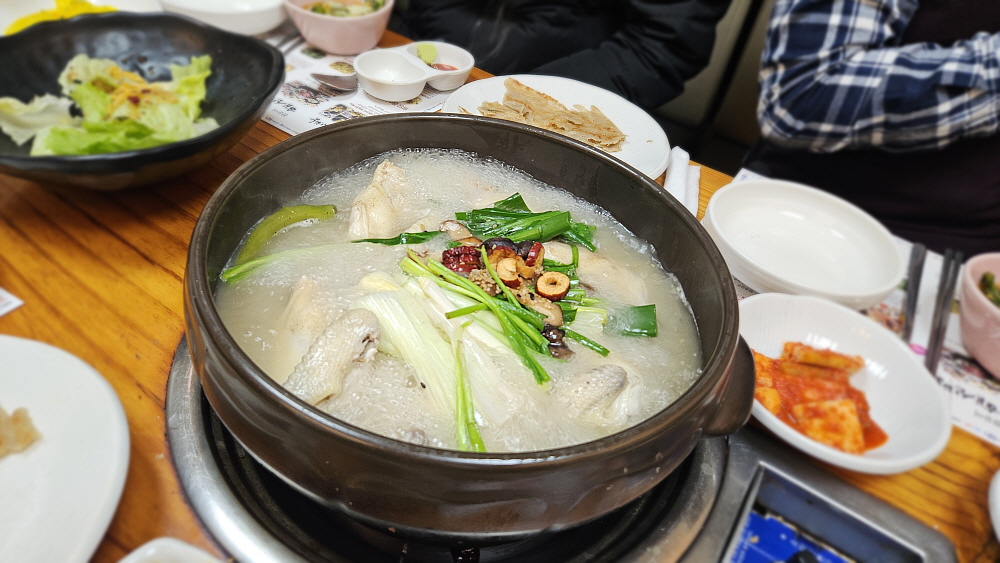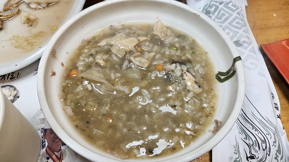 닭도 맛이 괜찮았지만 가장 압권은 마지막의 죽이었다. 영양이 듬뿍 배어 있는 국물에 쌀을 넣고 조금 끓인 간단한 죽이지만 어찌나 진한 맛이 나던지 다들 그 죽에 코를 박고 먹는 모습이었다. 배가 부름에도 불구하고 죽 한 그릇을 꼭 먹어야 한다. 마지막의 영양이 여기 다 들어 있기 때문이다. 보기엔 그래도 아무튼 마무리가 아주 훌륭했다. 밖의 날씨가 꽤 쌀쌀했음에도 이런 좋은 음식을 든든하게 먹어서인지 추위를 거의 느끼지 못했다. 역시 몸에 좋은 음식은 피가 되고 살이 되는 법이다. 이 계절에 잘 어울리는 훌륭한 보양식 맞다. 이걸로 올해는 건강하게 마무리 하는 것으로...