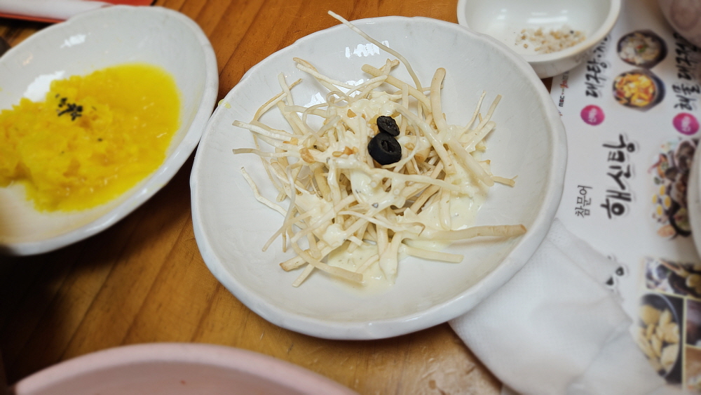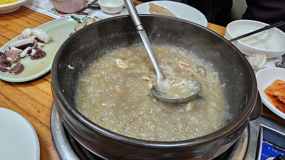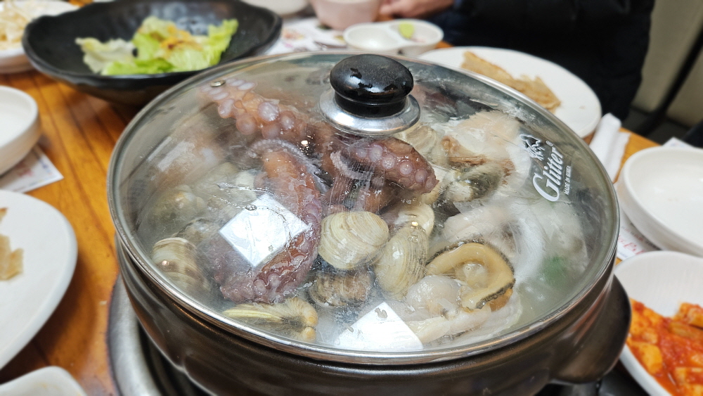 이집의 해신탕에는 조개와 낙지 그리고 큰 닭 한마리가 들어간다. 해물은 다 살아 있는 채로 냄비에 입수되었다. 조개나 낙지들에게는 미안한 일이지만 이렇게 신선한 재료를 끓인다는 것이 맘에 들었다. 몸에 좋은 재료는 역시 신선한 것이어야 한다. 국물은 맛이 있고, 없고를 떠나 그 자체로 보양식이라 할 수 있을 것이다. 해신탕이 끓기까지 시간이 좀 걸리기 때문에 다른 것들을 먼저 조금씩 먹기 시작했다. 점심이 아니라면 허리띠 풀고 앉아 느긋하게 즐길텐데 그럴 시간적인 여유는 없었다. 좀 일찍 나왔지만 끓는데만 시간이 걸렸기 때문에 아무래도 마음이 조급해지기 시작했다.