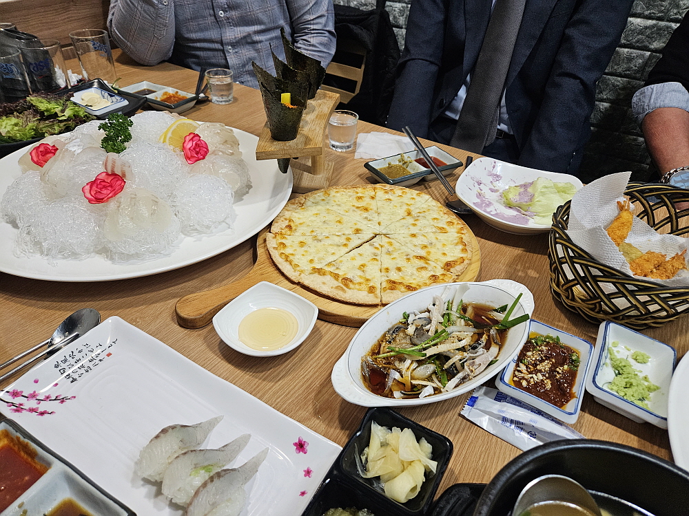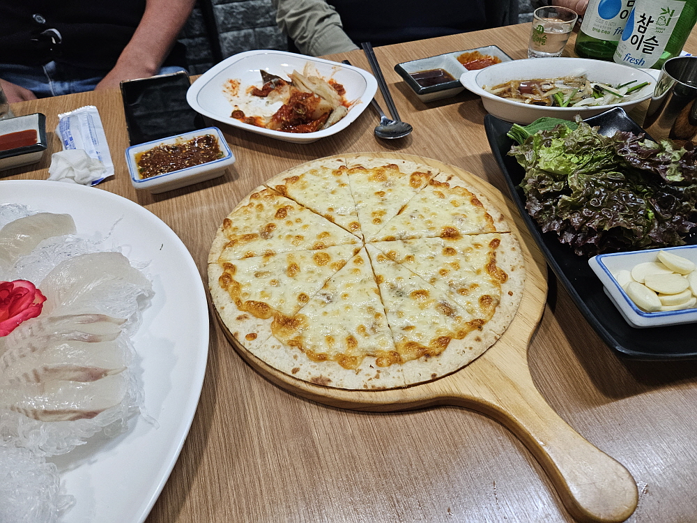 후식 비슷하게 안주 겸으로 고르곤졸라 피자가 나왔다. 얇은 피자라 나중에 먹어도 부담이 없는 안주거리다. 주인장의 아이디어가 엿보이는 순간이다. 신선한 회와 기름진 피자의 만남이라... 술꾼들의 마음을 제대로 저격하는 비장의 무기라 하겠다. 횟집에서의 회식은 늘 훈훈한 건배와 덕담으로 마무리된다. 그만큼 이곳에서의 회식이 맘에 들었다는 증거다. 다음에도 회식을 하게 된다면 여길 찾게 될 것이다. 그래서 몇 번이고 오게 될 것 같다. 그렇게 부담없고, 맛있고, 분위기 좋은 급이 있는 횟집을 잘 찾아 왔다.