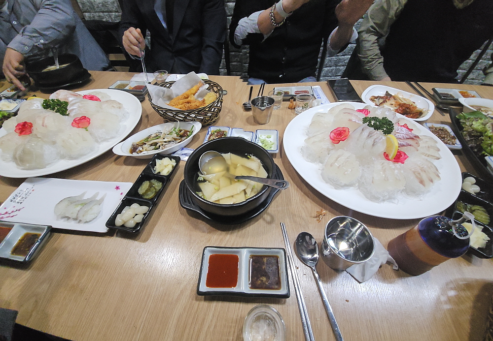 본 요리인 모듬회가 나오기 전에 일단 푸짐할 정도의 스끼다시, 즉 반찬들이 줄줄이 나온다. 사실 회를 별로 좋아하지 않는 사람들도 이런 집에 오면 함께 즐겁게 회식에 참여할 수 있다. 회 말고도 먹을 것이 너무 많기 때문이다. 실제 우리는 본 요리가 나오기도 전에 소주병을 꽤나 많이 비웠다. 배가 어느 정도 찼지만 꽃이 피어 있는 것 같은 예쁜 모양의 모듬회를 보니 다시 입맛을 다시게 되었다. 생선회를 소주 말고 다른 어떤 술로 함께 먹어야 할까? 다른 주종이 떠오르지 않는다. 역시 생선회는 소주가 찰떡궁합이다.