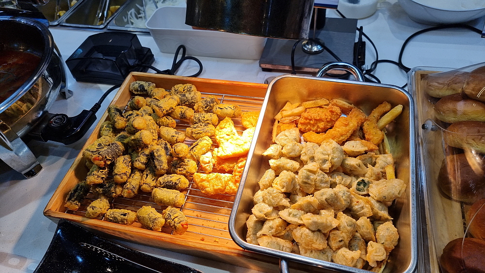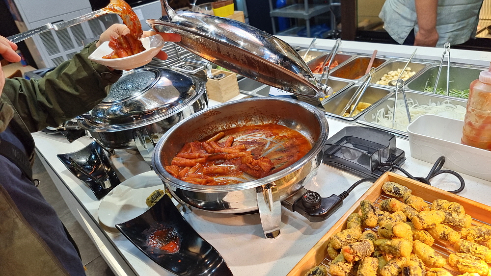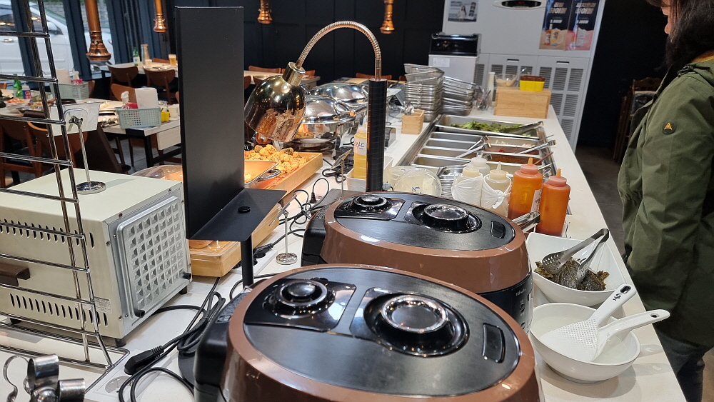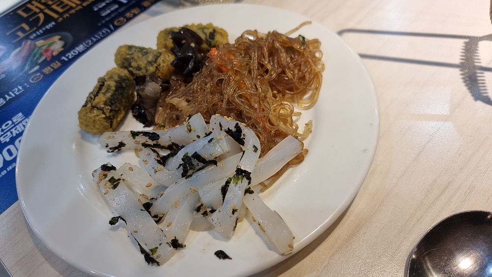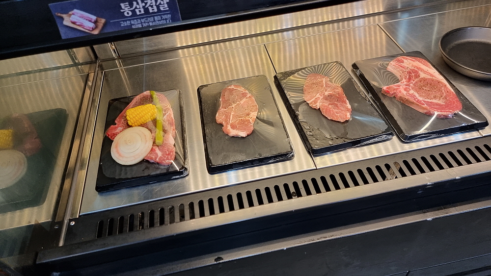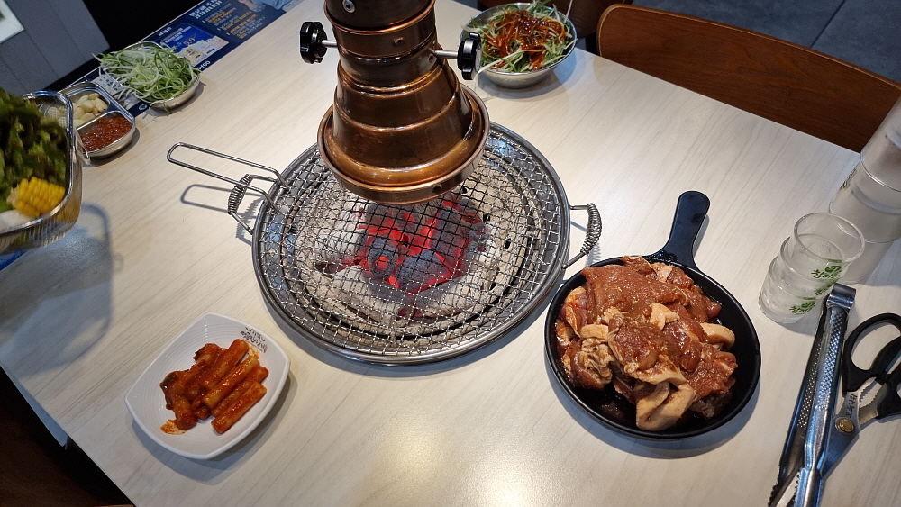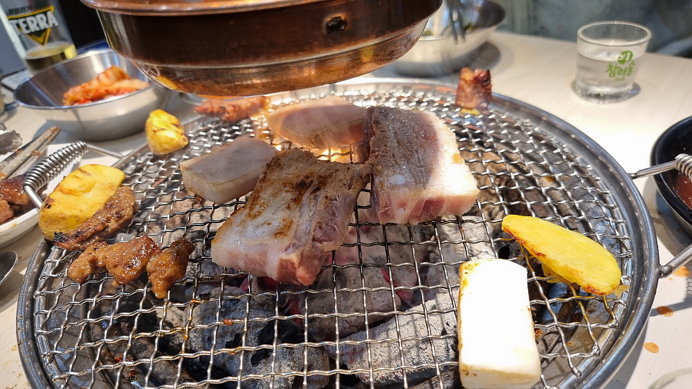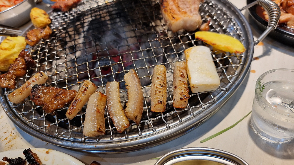 물가가 올라 이곳도 일인분 이용가격이 좀 오르기는 했다. 19,900원이라 하면 그냥 20,000원이라 보는 것이 편할 것이다. 고기를 무한리필하는 곳이지만 알차게 구성된 샐러드바도 있다. 거기에서 밥과 김치, 반찬들을 가져다 먹으면 된다. 잡채도 있고, 떡볶이도 있다. 고기보다 이런 반찬에 먼저 눈이 가면 안 되는데 암튼 푸짐한 구성이 맘에 들었다. 주인장이 숯불을 가지고 오면 그 때부터는 손님들이 열심히 다니며 먹고 싶은 고기들을 리필하면 된다. 그냥 돼지갈비만 있는 것이 아니라 삼겹살도 있고, 이날의 진정한 갑이었던 맛난 돼지껍데기도 있다.