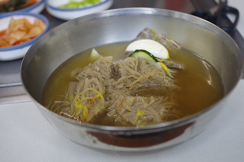 물론 알싸한 양념의 비빔냉면이나 회냉면도 나쁜 것은 아니지만 역시 시그니쳐 메뉴는 바로 이 물냉면이라 할 것이다. 거기에 약간의 식초와 내 경우엔 듬뿍 넣는 편인 겨자를 넣고 살살 섞어 주면 영혼을 위로하는 기억 속의 그 맛이 드디어 완성된다. 물냉면의 육수는 역시 내 생각대로 양짓머리 고기육수와 동치미 국물이 주된 것이었다. 적당히 섞인 그 맛은 시원하면서도 감칠맛이 나는 우리가 아는 바로 그 물냉면 육수 맞다.