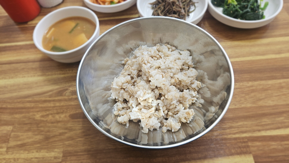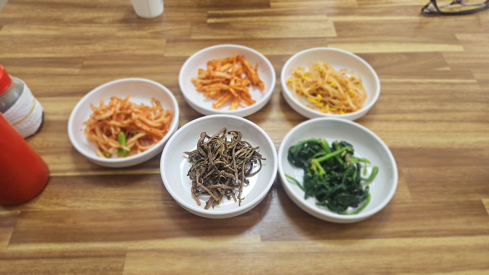 우리의 처음 의도는 칼국수를 먹는 것이었다. 하지만 막상 들어가보니 그냥 면만 파는 곳이 아니라 백반같은 밥도 파는 식당이었다. 그래서 계획을 변경하여 보리밥을 먹기로 했다. 농촌 인심이 분명히 좋을 것이고, 가격이 8천 원이라는 사실에 일단 모든 것이 좋아 보였다. 그렇게 조금 앉아 있노라니 먼저 밑반찬이 나왔다. 다섯 가지의 나물들이었는데 조촐하지만 맛은 제대로 나는 시골밥상의 반찬이었다. 이런 반찬을 보리밥에 넣고 비벼 먹는 방식인 것 같았다. 이렇게 소박하고, 조금은 투박한 밥상 정말 좋아한다. 한국 사람치고 안 좋아하는 사람은 거의 없을 것이다.