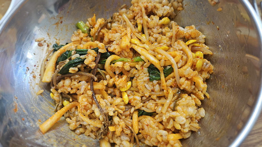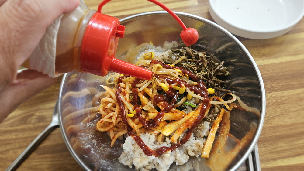 반찬 그릇에 담겨 나온 나물을 모두 밥그릇에 때려 넣고, 고추장을 넣은 뒤 뚜껑만 열어봐도 고소한 냄새가 진동하는 참기름을 넉넉하게 두르고 비비기 시작했다. 비빔밥은 외국인들도 아주 좋아하는 한국 음식이라고 하지 않던가... 왠만한 집에 있는 오래된 반찬들도 고추장과 보리밥, 그리고 참기름만 있으면 이렇게 근사한 한 끼 식사로 변신하는 것이 바로 비빔밥이다. 굳이 전주에 가서 비싼 값을 내고 먹지 않아도 우리는 충분히 비빔밥의 매력을 즐길 수 있다. 시골 된장찌개가 함께 하는 잘 비벼진 비빔밥은 보고만 있어도 입안에 침이 고였다. 이것이 진정한 우리의 밥이다.
