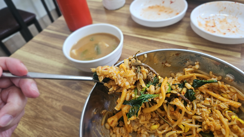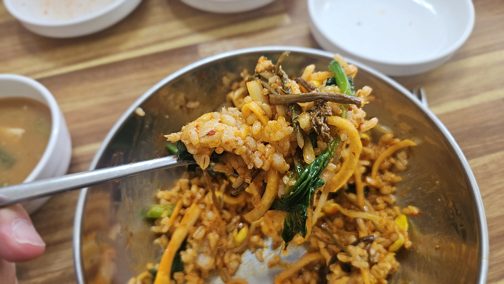 비빔밥을 먹으면 항상 평소보다 과식을 하게 된다. 당연한 일이다. 모든 재료를 한데 모아 먹다보면 그럴 수밖에 없다. 하지만 부담스럽지는 않다. 남은 반찬들을 모두 떨어 버릴 수 있는 기회이기도 하다. 언제부터인지 보리밥 집에 가면 늘 이런식으로 밥과 나물을 한데 넣고 비벼 먹는 것이 국룰처럼 되어 버렸다. 가성비가 워낙 좋다보니 꽤나 만족스러웠다. 연풍면은 어떤 이슈가 있는지 몰라도 우리가 먹는 동안 근처에서 공사를 하는 것 같은 사람들이 와서 같이 식사를 했다. 도로공사나 공장을 짓는 그런 일을 하는 사람들 같았다. 요즘 시골은 이런 개발 예산이 없다면 정말 일이 별로 없을 것이다.