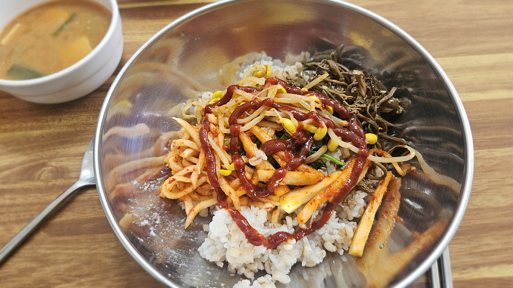 반찬 그릇에 담겨 나온 나물을 모두 밥그릇에 때려 넣고, 고추장을 넣은 뒤 뚜껑만 열어봐도 고소한 냄새가 진동하는 참기름을 넉넉하게 두르고 비비기 시작했다. 비빔밥은 외국인들도 아주 좋아하는 한국 음식이라고 하지 않던가... 왠만한 집에 있는 오래된 반찬들도 고추장과 보리밥, 그리고 참기름만 있으면 이렇게 근사한 한 끼 식사로 변신하는 것이 바로 비빔밥이다. 굳이 전주에 가서 비싼 값을 내고 먹지 않아도 우리는 충분히 비빔밥의 매력을 즐길 수 있다. 시골 된장찌개가 함께 하는 잘 비벼진 비빔밥은 보고만 있어도 입안에 침이 고였다. 이것이 진정한 우리의 밥이다.
