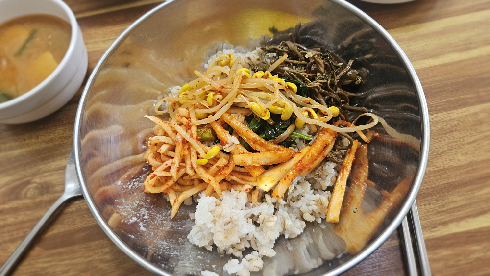 우리의 처음 의도는 칼국수를 먹는 것이었다. 하지만 막상 들어가보니 그냥 면만 파는 곳이 아니라 백반같은 밥도 파는 식당이었다. 그래서 계획을 변경하여 보리밥을 먹기로 했다. 농촌 인심이 분명히 좋을 것이고, 가격이 8천 원이라는 사실에 일단 모든 것이 좋아 보였다. 그렇게 조금 앉아 있노라니 먼저 밑반찬이 나왔다. 다섯 가지의 나물들이었는데 조촐하지만 맛은 제대로 나는 시골밥상의 반찬이었다. 이런 반찬을 보리밥에 넣고 비벼 먹는 방식인 것 같았다. 이렇게 소박하고, 조금은 투박한 밥상 정말 좋아한다. 한국 사람치고 안 좋아하는 사람은 거의 없을 것이다.