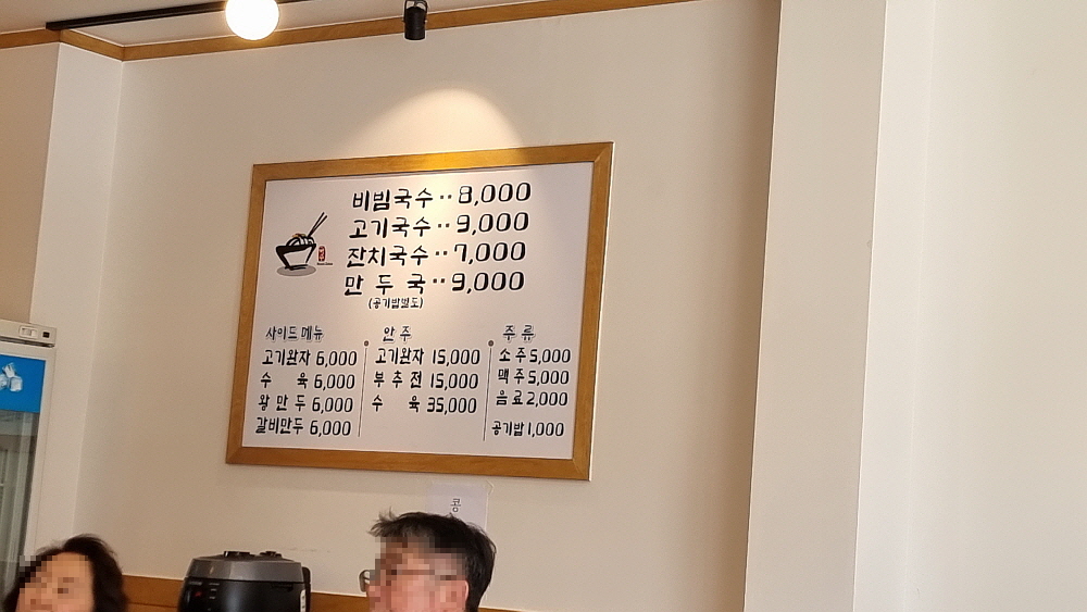 잔치국수는 7,000원 이라는 비교적 저렴한 가격이지만 나머지들은 국수치고는 싼 가격이라 하기 좀 그런 편이었다. 우리는 잔치국수와 비빔국수 그리고 사이드메뉴인 고기완자와 만두를 주문했다. 국수를 싫어하는 사람이 함께 간다면 이런 구성도 나쁘지 않을 것 같다. 작은 주방에서 한 사람이 음식이 만들기 때문에 손님들이 몰리며 아무래도 시간이 꽤 걸리는 것 같았다. 우리도 앞에 세 팀이나 있었기 때문에 거의 30분 정도 기다려야 했다. 국수집 특징이 음식이 빨리 나오는 것인데 그런 점에서 보면 약간의 인내가 필요한 곳이다.