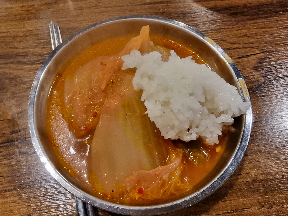 찌개 속에는 돼지고기도 넉넉하게 들어 있었다. 결코 단촐한 구성이 아니었다. 고기맛이 듬뿍 밴 찌개국물에 밥을 말아 먹듯 먹으면 그 맛은 참 형용하기 어렵다. 정말 끝내준다. 한국인이라면 피할 수 없는 절대적인 유혹이 되겠다. 국물을 그냥 떠먹기도 하고, 밥을 말아 먹기도 하고, 김치와 함께 먹기도 한다. 이런 행동을 무한히 반복할 수 있을 것 같다. 고기맛이 진한 국물은 이것이 과연 김치찌개인지, 곱창전골인지 헛갈릴 정도로 묵직한 맛을 선사했다. 이런 김치찌개는 참 대단한 힘을 가지고 있는 것 같다. 숟가락질을 멈추기 힘들다.