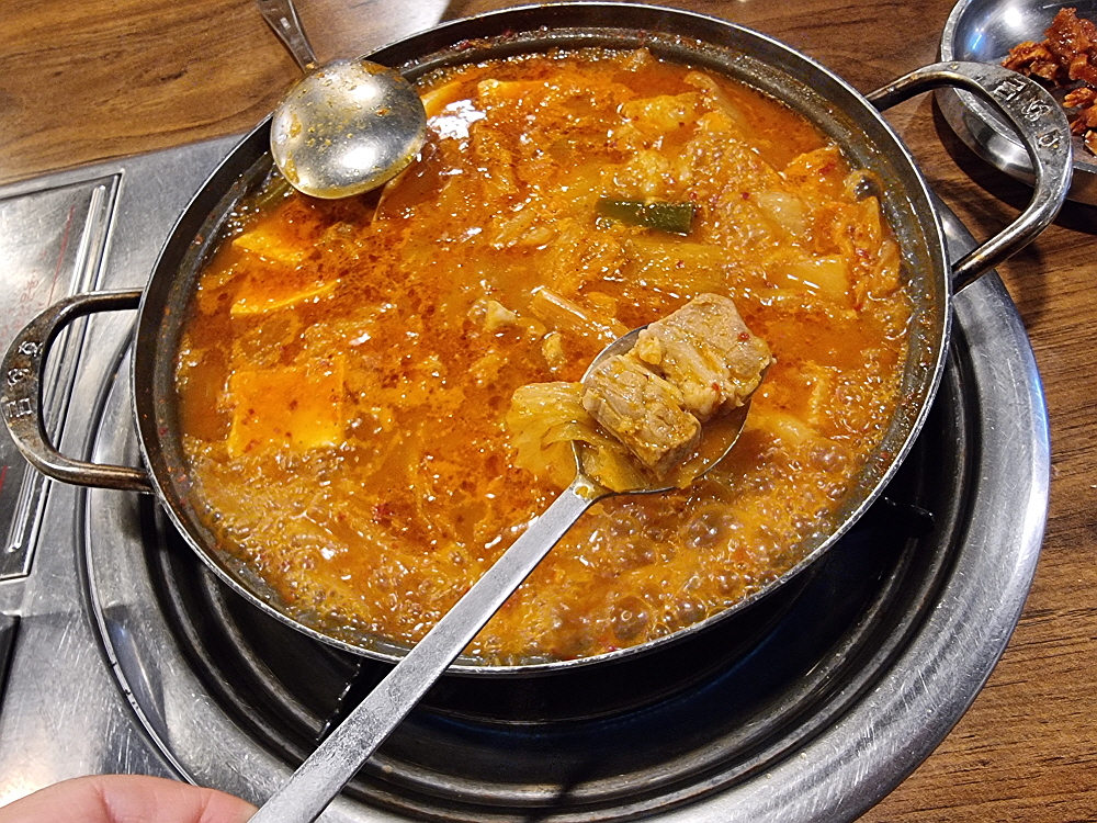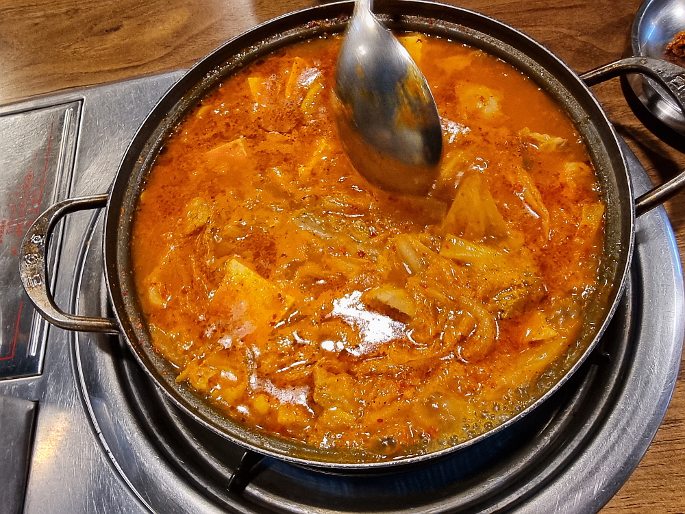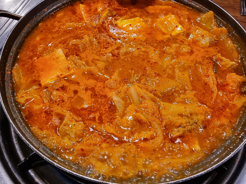 8천 원짜리 김치찌개라지만 조기까지 구워져 반찬으로 나왔다. 이러면 괜히 기분이 좋고, 감사한 마음이 든다. 이집 김치찌개는 다른 집에선 보기 힘든 매우 독특한 육수에 끓여져 나온다. 이걸 뭐라고 할까? 진한 곱창국물 같다고 할까? 김치찌개도 여러 버전이 있다지만 이런 진한 기름맛의 국물은 잘 먹어보지 못한터라 매우 특이했다. 거기에 김치가 묵은지처럼 시큼한 것이 보고만 있어도 입에 침이 고일 지경이었다. 이런 치명적인 맛을 가진 찌개는 과식을 유발한다. 조심해야 한다. 안 그러면 다 먹고 나서 배를 부여쥐게 될지도 모른다.