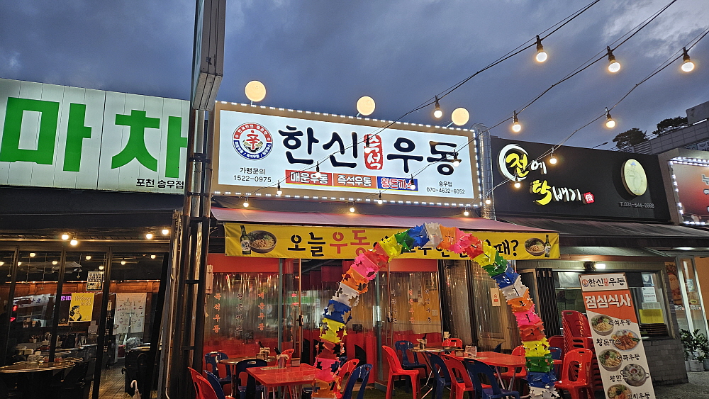 백종원의 체인점으로 유명한 한신포차인줄 알고 갔다가 다른 집이란 것을 이번에 알게 된 우동집이 송우리에 있다. 송우초등학교 건너편 나름의 먹자상권이 작지만 형성되어 있는 거리에 이집이 있다. 이 일대가 송우리에서 유동인구가 제일 많은 곳인지라 이름있는 상가들이 제법 많이 있다. 말로만 들었지 들어 간 본 것은 이번이 처음인 한신즉석우동은 실내도 과거 길거리에 늘어서 있던 빨간 비닐천막의 포장마차를 구현하려고 노력한 티가 났다. 테이블마다 작은 천막으로 파티션이 나뉘어 있어 포장마차 분위기에 나름의 독립성도 어느 정도는 만들어진 곳이라 하겠다.