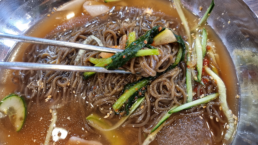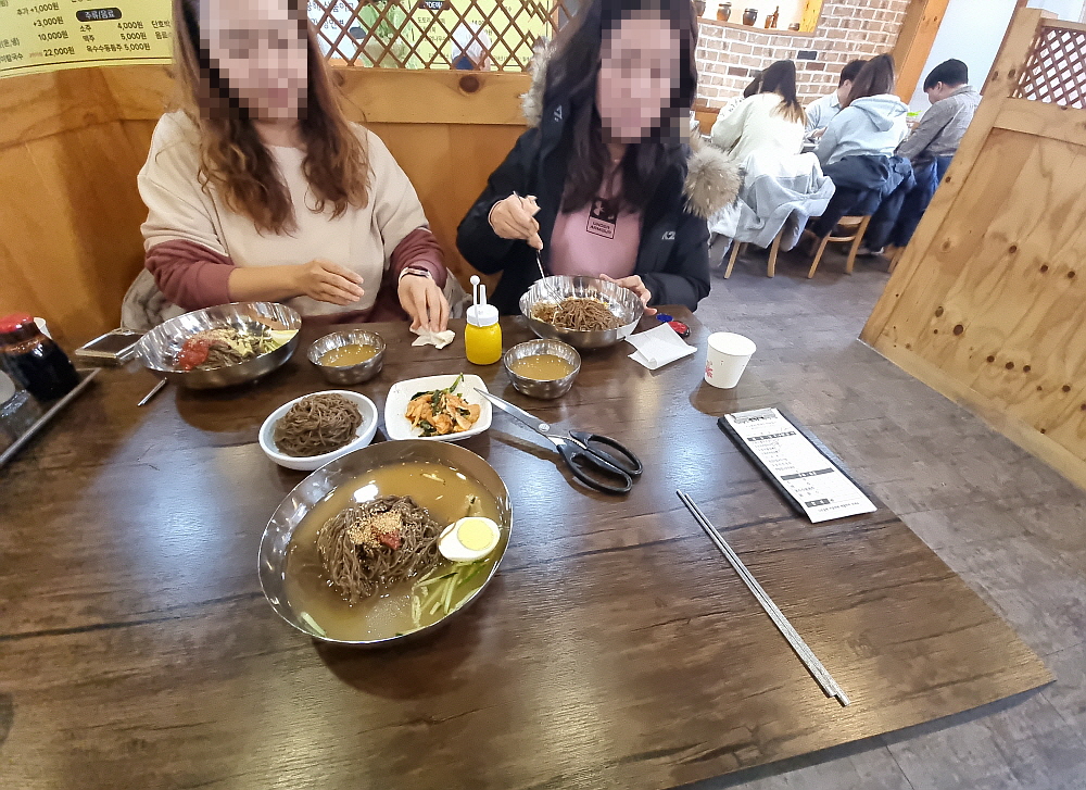 벚골도토리 막국수의 가격은 물이 9,000원, 비빔은 만 원이다. 비빔이 더 비싼 이유는 양념이 들어가기 때문이겠지? 도토리 가루가 들어간 면은 다른 막국수 면들보다 검은 빛이 강하다. 관인에서 먹을 때는 면의 맛도 다소 쌉쌀한 것이 도토리 맛 비슷하게 나긴 했는데 여기서는 그 정도의 차이가 날 정도의 강한 맛은 없었다. 도토리의 강한 맛에 거부감이 있는 사람들도 부담없이 먹을 수 있을 정도라 하겠다. 굳이 가위를 주지 않아도 면을 먹는데 큰 지장이 없을 정도로 질긴 면은 아니었다. 막국수가 맛도 맛이지만 건강에 좋아 먹는 사람도 많다. 그렇다면 여기가 딱일 것이다.