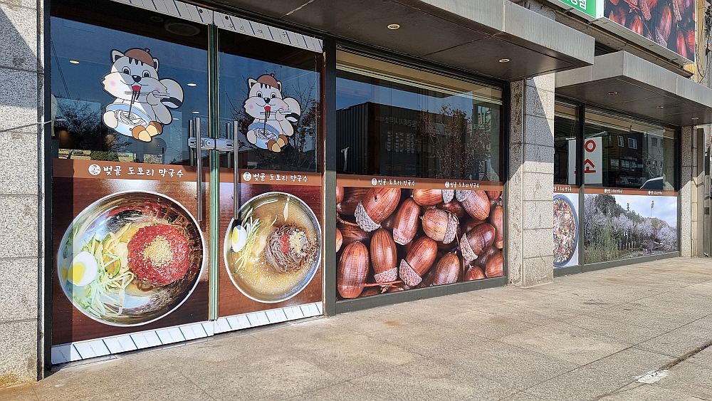관인면의 본점을 다닐 때는 잘 몰랐는데 벚골도토리 막국수의 마스코트는 다람쥐였다. 아마 도토리라는 이미지에 잘 어울리는 예쁜 캐릭터를 찾은 것 아닐까 싶다. 다람쥐의 주식이 도토리이니까 우리가 걔들의 주식을 같이 먹는 셈이다. 도토리는 너무나 흔한 먹거리같지만 사실 손이 많이가는 재료이다. 요즘은 중국산도 있어 구하는 것이 어렵지는 않다지만 예전에는 산으로 다니며 주워야 했다. 가루를 내고 묵을 만드는 과정은 지난한 인고의 시간이기도 하다. 이렇게 흔한 듯 하지만 다루기 쉽지 않은 도토리가 건강에는 좋다고 한다.