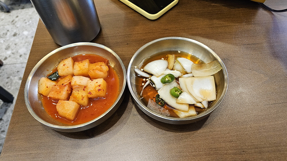 이집의 막국수는 면발이 아주 굵은 편이었다. 망향국수집의 중면같은 느낌이었다. 이렇게 굵은 면의 막국수도 일찌기 먹어본 적이 별로 없는 것 같다. 뭔가 다 특별한 그런 느낌의 식당이라 하겠다. 육전을 올려 먹는 굵은 면발의 막국수는 아주 만족스러웠다. 방이동 먹자골목에 그렇게나 많은 식당이 있지만 우리가 다른 곳을 가기도 전에 이집으로 바로 들어온 보람이 있는 맛이다. 좁은 식탁에 앉아 먹지만 이런 가성비라면 아무 불만이 없다. 김치와 깍뚜기는 셀프서비스 이기 때문에 눈치 보지 않고 맘껏 갖다 먹을 수 있다. 이런 것도 나쁘지 않다.
