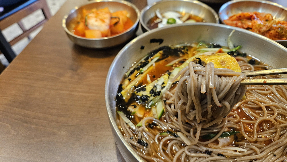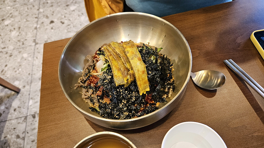 물과 비빔 중에 뭐가 더 나은가 하는 질문을 한다면 단연코 여기는 비빔막국수를 먹어야 한다. 육전과 잘 어울리는 것이 매콤 달콤한 양념이기 때문이다. 물 막국수의 육수는 따로 식초를 넣지 않아도 될 정도로 시큼했는데 미리 식초를 넣는 것인지 육수 자체를 그렇게 만든 것인지 모르겠지만 시큼한 맛을 그닥 좋아하지 않는 사람은 호불호가 갈릴 수 있는 맛이다. 면은 좋지만 시큼한 육수는 좀 부담스러웠다. 하지만 비빔의 경우는 그런 시큼함이 오히려 더 식감을 좋게 만드니 여기에선 비빔을 주문하는 것이 현명한 일이리라. 어쨌든 우리야 맛나게 잘 먹었으니 그걸로 되었다.