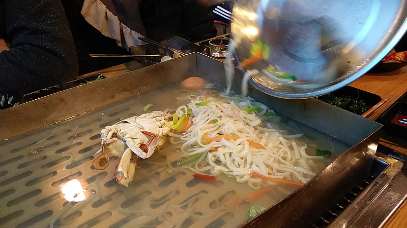 정말 특이했던 것은 숙주를 엄청 올려 주었다는 것이다. 보통 이런식으로 찜 집에서는 주지 않는 아이템이었다. 나야 숙주를 워낙 좋아하니 관계없지만 과연 모든 사람이 좋아할지는 모르겠다. 잘 익어 부드럽고 아삭한 숙주에 조개를 놓고 고추냉이 간장을 조금 넣어 먹으면 그 맛이 정말 끝내줬다. 술잔을 들고 그대로 조개 먹고 술 마시고, 술 마시고 조개먹고를 무한 반복하고 싶은 그런 맛이었다. 양이 적지 않아 보였는데 정말 소주 2병 먹는 사이에 그 많던 조개들이 다 사라지고 말았다. 뭘 추가하여 넣느니 마느니 하다가 우린 그냥 칼국수만 넣어 먹기로 했다.