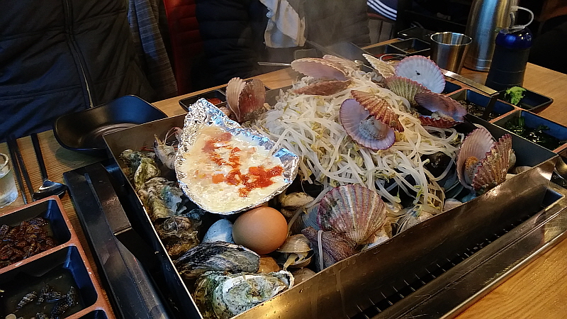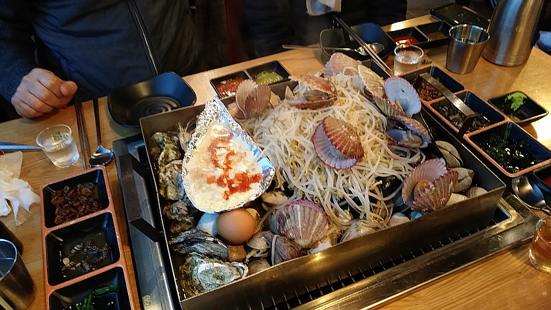 술 먹으러 오면서 몸에 좋으라고 홍삼을 챙겨 온 동생 덕에 오늘은 그래도 좀 몸을 보 하면서 먹을 수 있게 되었다. 홍삼을 소주에 타 마시면 더 많이 먹게 된다고 오히려 해로울 수 있다고 말하던 사람도 있긴 했다. 하지만 어쨌든 그 마음이 갸륵한 것 아닌가? 형님 몸 생각해 가면서 술을 마시라는 배려 말이다. 그렇게 우리의 조개 만찬은 시작되었다. 여긴 주로 조개가 메인으로 많이 나가는 것 같았다. 커다란 팬 위에 각종 조개와 굴, 숙주 등을 얹어서 아주 푸짐하게 한 상이 나왔다. 국물도 떠 먹을 수 있어서 저녁으로도 술 안주로도 제격이었다. 다만 국물이 좀 너무 짜다는 생각은 들었다. 조개 자체가 짠데 아마도 거기에 다시 뭔가 조미료 같은 것을 가미했는가 보다. 우리는 연신 물을 부어가면서 먹었다. 국물이 계속 졸아드니 짠 기운이 없어지질 않았다.