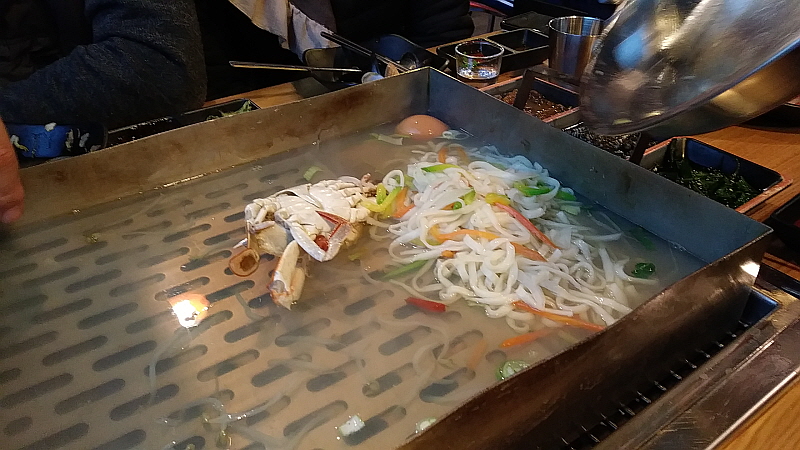 정말 특이했던 것은 숙주를 엄청 올려 주었다는 것이다. 보통 이런식으로 찜 집에서는 주지 않는 아이템이었다. 나야 숙주를 워낙 좋아하니 관계없지만 과연 모든 사람이 좋아할지는 모르겠다. 잘 익어 부드럽고 아삭한 숙주에 조개를 놓고 고추냉이 간장을 조금 넣어 먹으면 그 맛이 정말 끝내줬다. 술잔을 들고 그대로 조개 먹고 술 마시고, 술 마시고 조개먹고를 무한 반복하고 싶은 그런 맛이었다. 양이 적지 않아 보였는데 정말 소주 2병 먹는 사이에 그 많던 조개들이 다 사라지고 말았다. 뭘 추가하여 넣느니 마느니 하다가 우린 그냥 칼국수만 넣어 먹기로 했다.