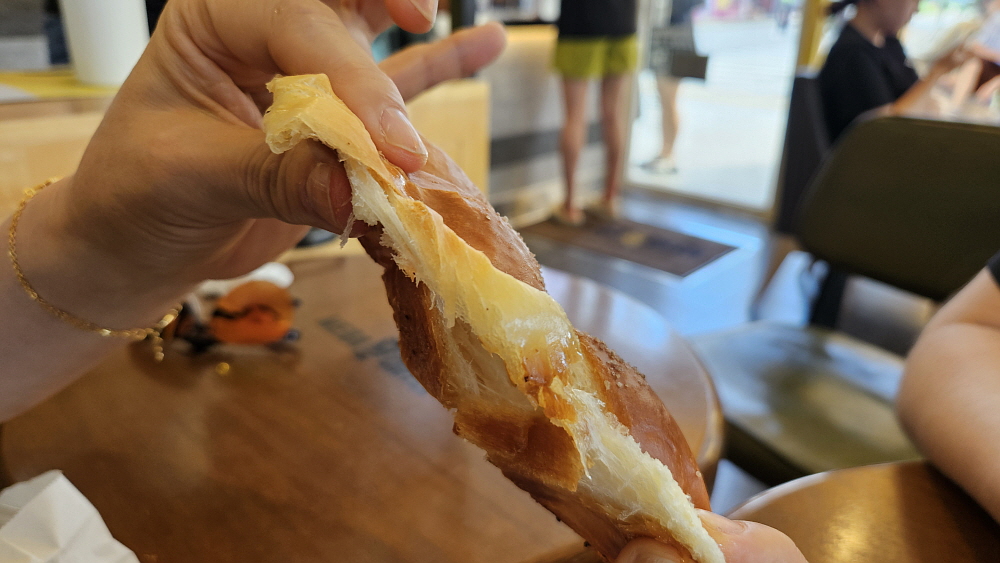 보기엔 다소 너무 소박해보이는 소금빵을 먹어 보았다. 쫙 찢어지는 글루텐의 모습을 보니 맛이 좋을 것 같았다. 그런데 막상 먹어보니 이것은 정말 예전엔 먹어보지 못한 천상의 맛이었다. 아직 이 정도로 맛난 소금빵은 먹어 본 적이 없다. 일본에서 일하는 아들도 소금빵의 원조가 일본이지만 여기 소금빵이 일본보다 더 맛나다고 했다. 어이가 없을 정도로 맛이 좋아 커피를 마시지도 않고 순식간에 다 먹어 치웠다. 과하다 싶을 정도로 버터가 많이 들어가고 특별히 공수한 천일염의 맛이라는 문구가 무색하지 않은 순간이었다. 과연 명불허전이구나... 사람들이 줄을 서서 살만 하구나 싶었다.